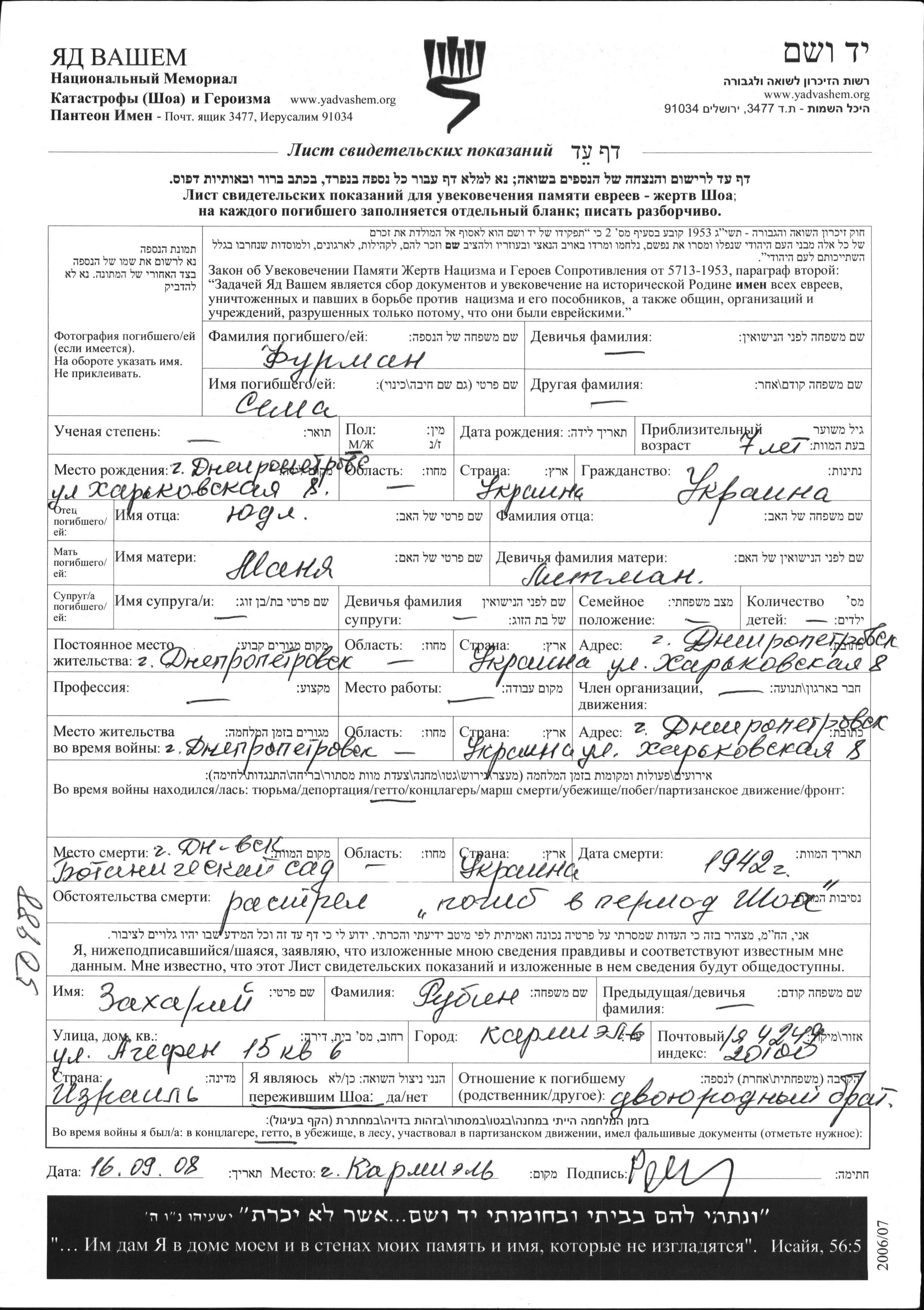 Syoma wurde in der Schoah ermordet. Todesort: Dnepropetrovsk, Ukraine (UdSSR) im Jahr 1942.