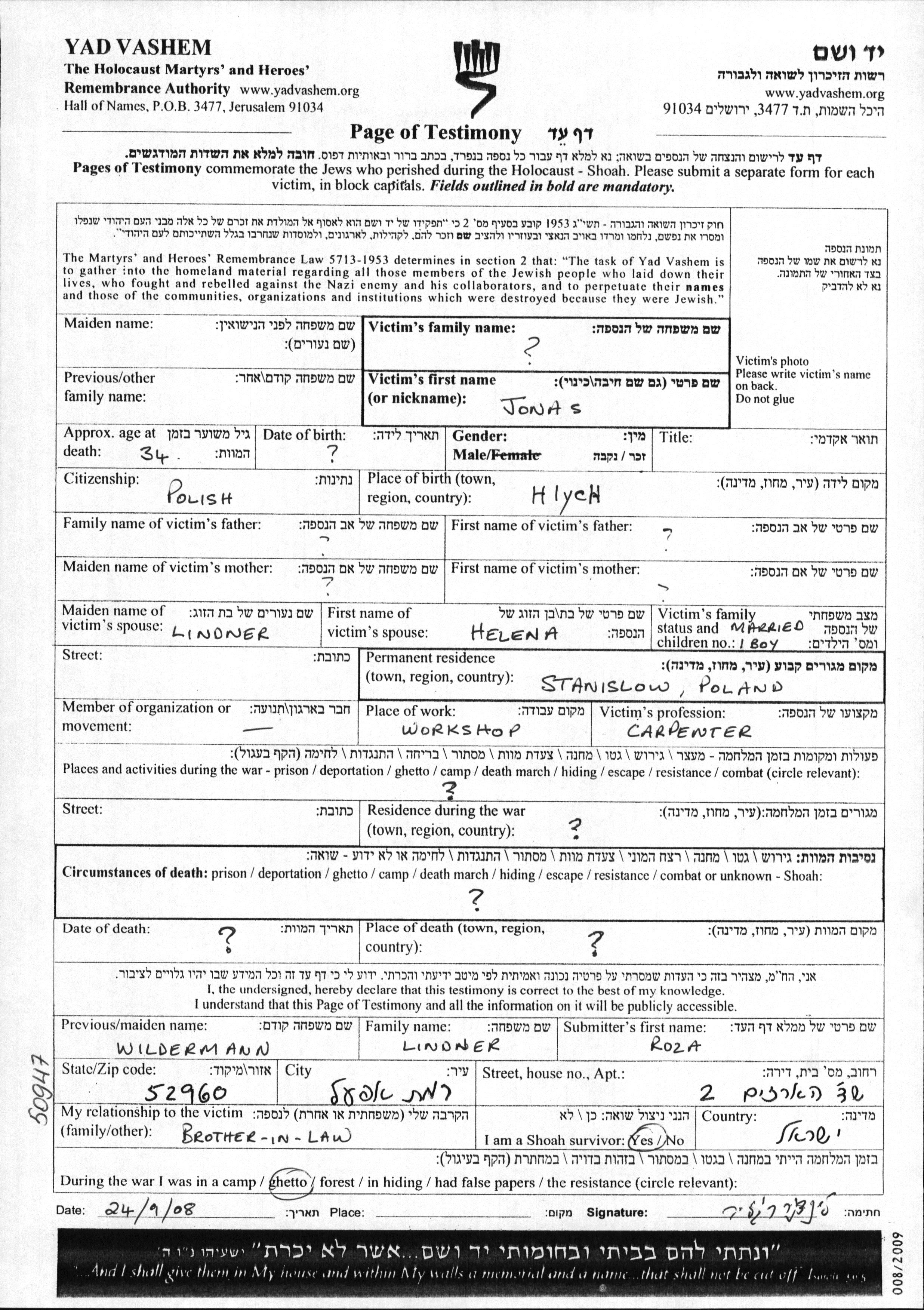 Jonas Name unbekannt wurde in Halicz, Polen geboren. Er war Zimmermann und mit Helena, geb. Linoner Verheiratet. Vor dem Zweiten Weltkrieg lebte er in Stanislaw, Polen.