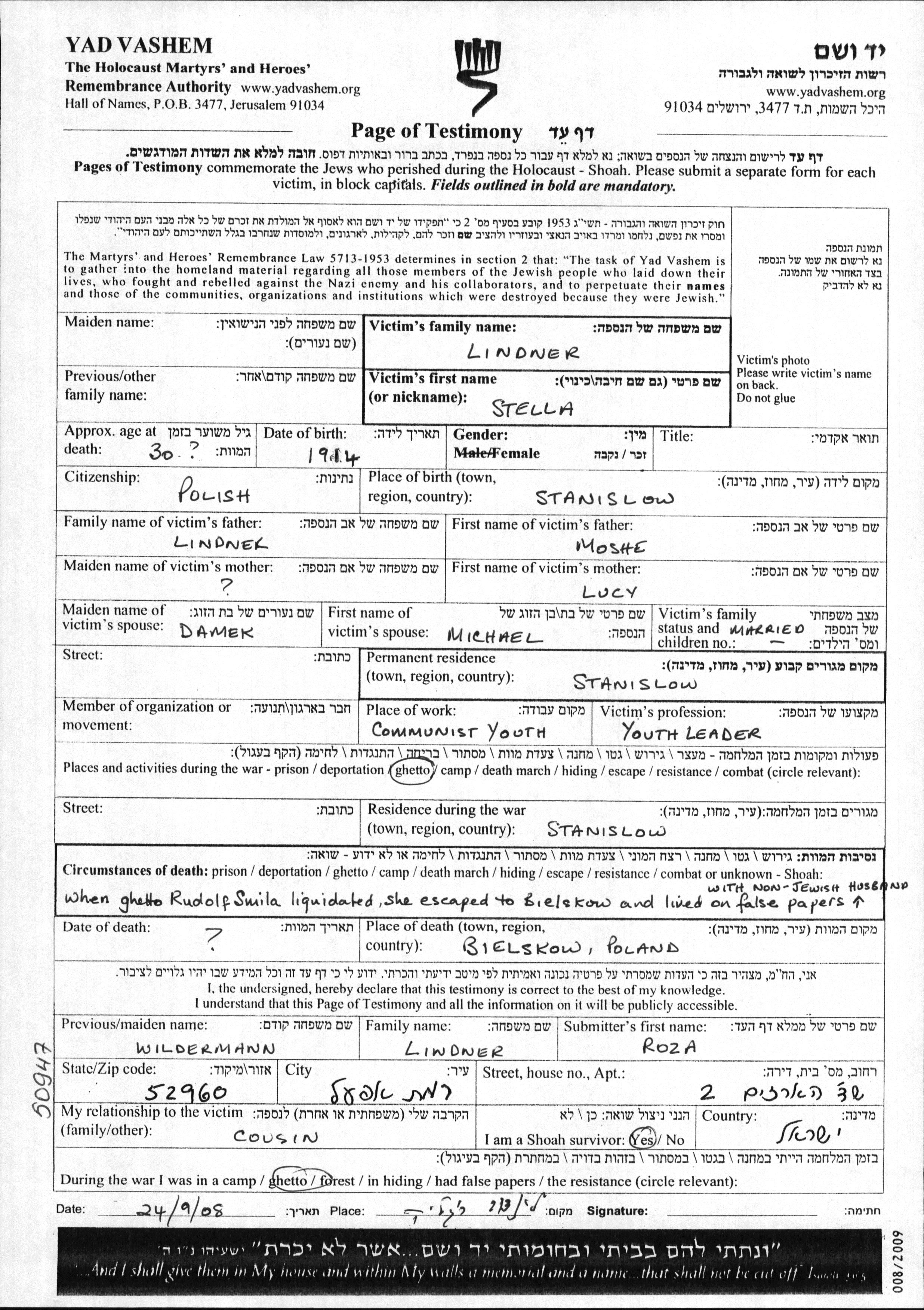 Stella Damek, geb. Lindner wurde im Jahr 1914 in Stanislaw, Polen geboren. Sie war die Tochter von Moshe und Lucy. Sie war Jugendbetreuer und mit Michael Verheiratet. Vor dem Zweiten Weltkrieg lebte sie in Stanislaw, Polen. Während des Krieges war sie in Stanislawow, Polen.