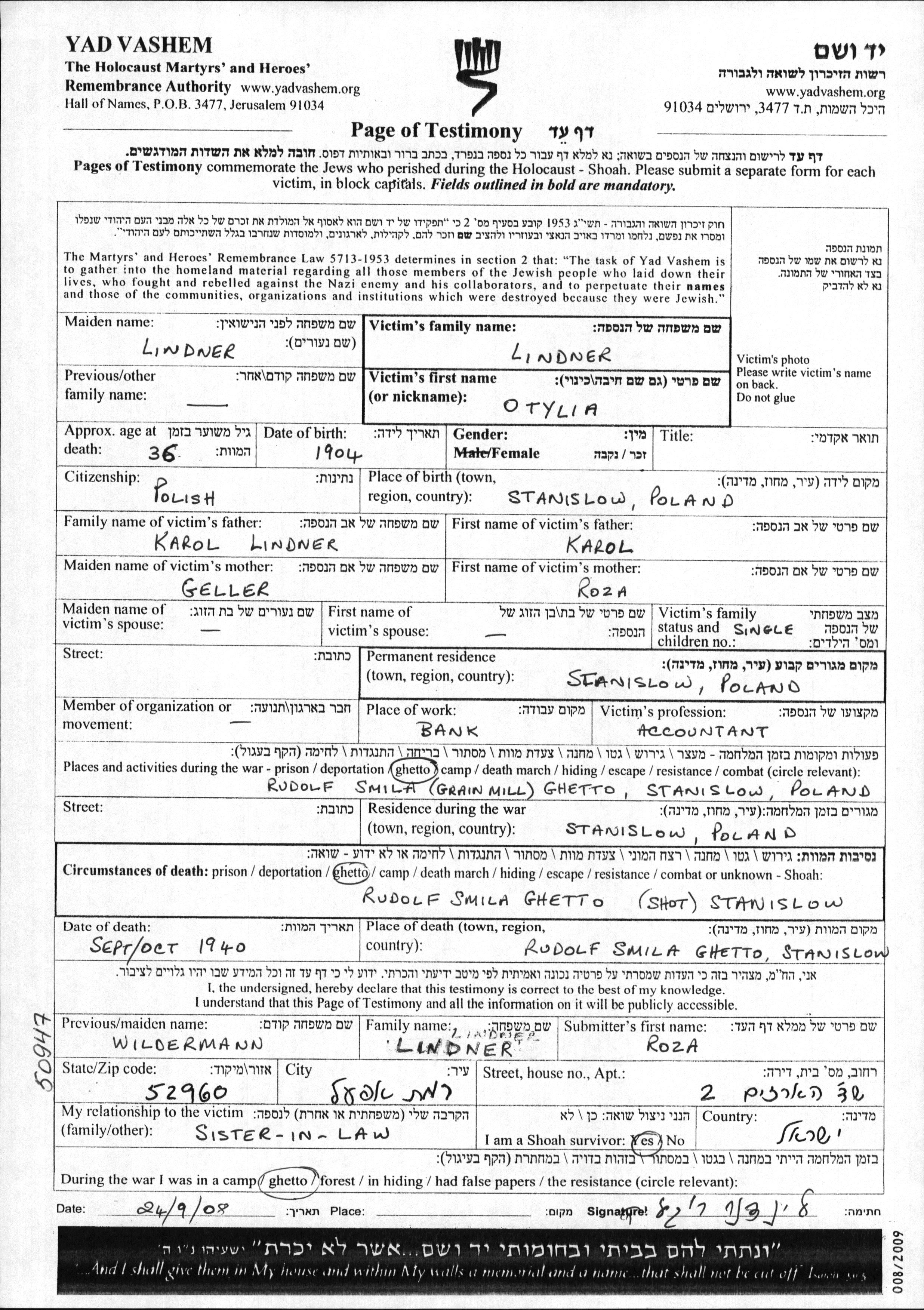 Otylia Lindner wurde im Jahr 1904 in Stanislawow, Polen geboren. Sie war die Tochter von Karol und Roza, geb. Geller. Sie war Bankbuchhalter und Ledig. Vor dem Zweiten Weltkrieg lebte sie in Stanislawow, Polen. Während des Krieges war sie in Stanislawow, Polen.