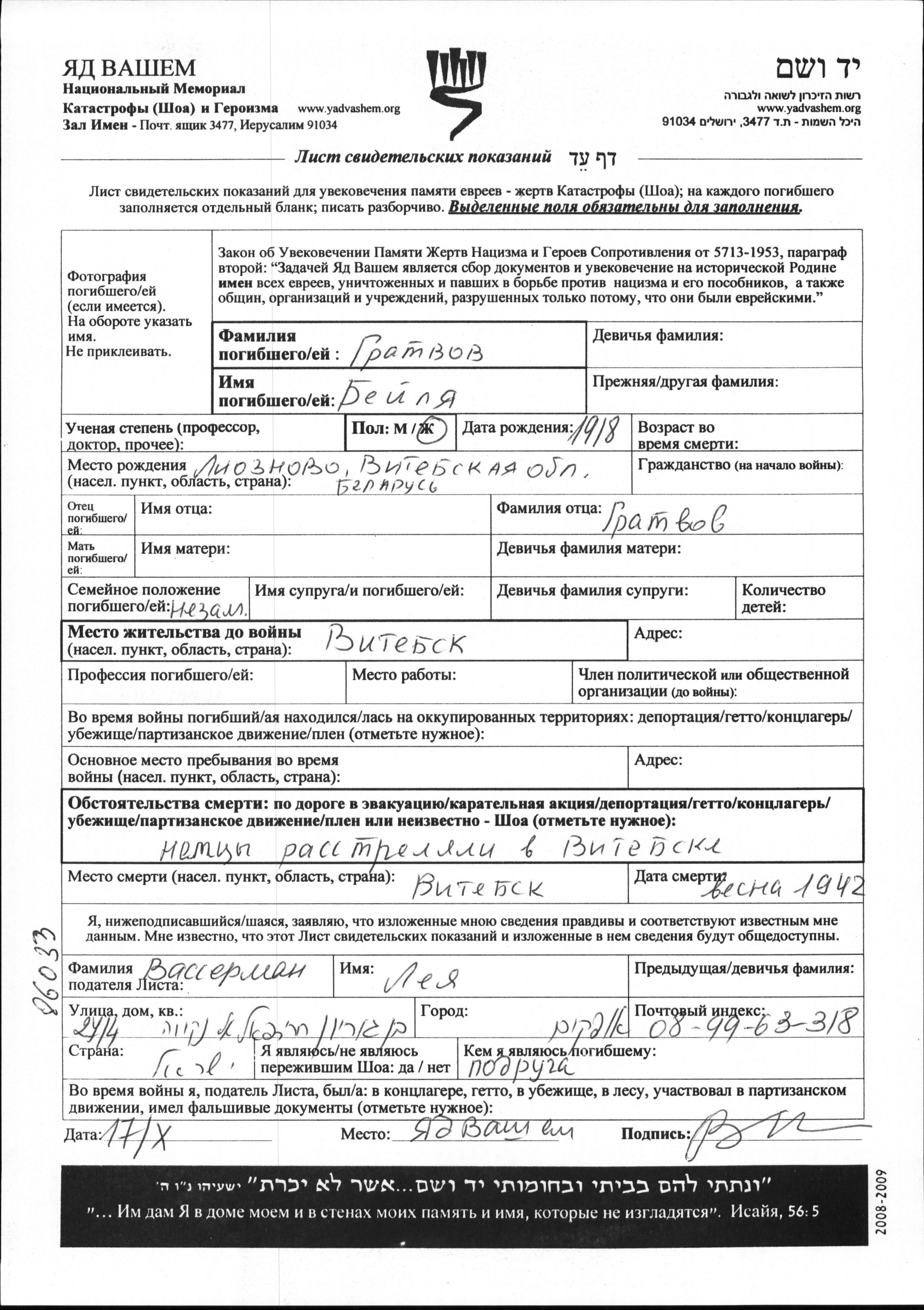 Beilya wurde in der Schoah ermordet. Todesort: Vitebsk, Weißrussland (UdSSR) im Jahr 04/1942.
