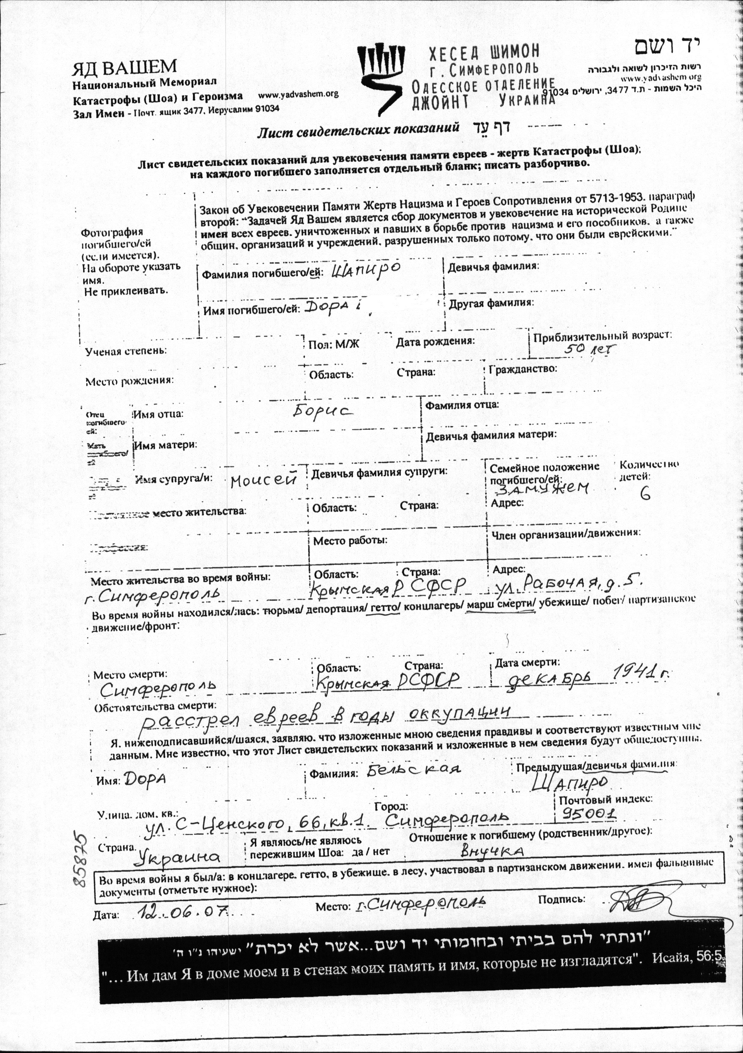 Dora Shapiro wurde Sie war die Tochter von Boris. Sie war mit Moisei Verheiratet. Vor dem Zweiten Weltkrieg lebte sie in Simferopol, Russland (UdSSR). Während des Krieges war sie in Simferopol, Russland (UdSSR).