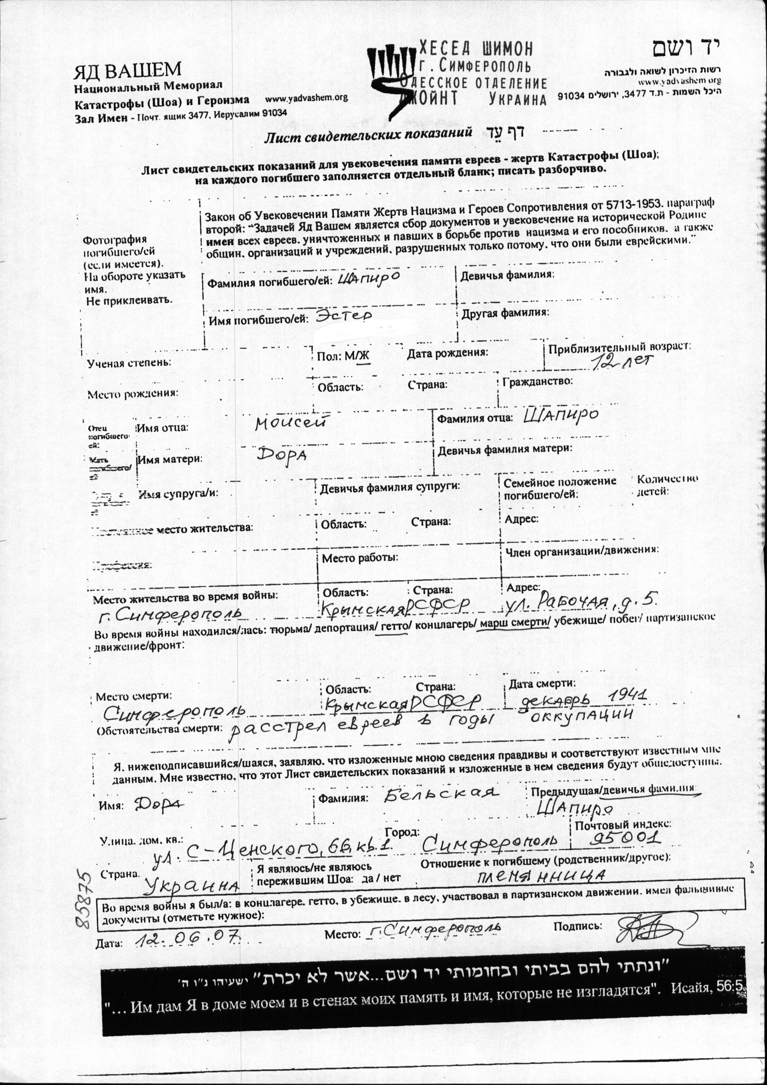 Ester Shapiro wurde Sie war die Tochter von Moisei und Dora. Sie war Kind. Vor dem Zweiten Weltkrieg lebte sie in Simferopol, Russland (UdSSR). Während des Krieges war sie in Simferopol, Russland (UdSSR).