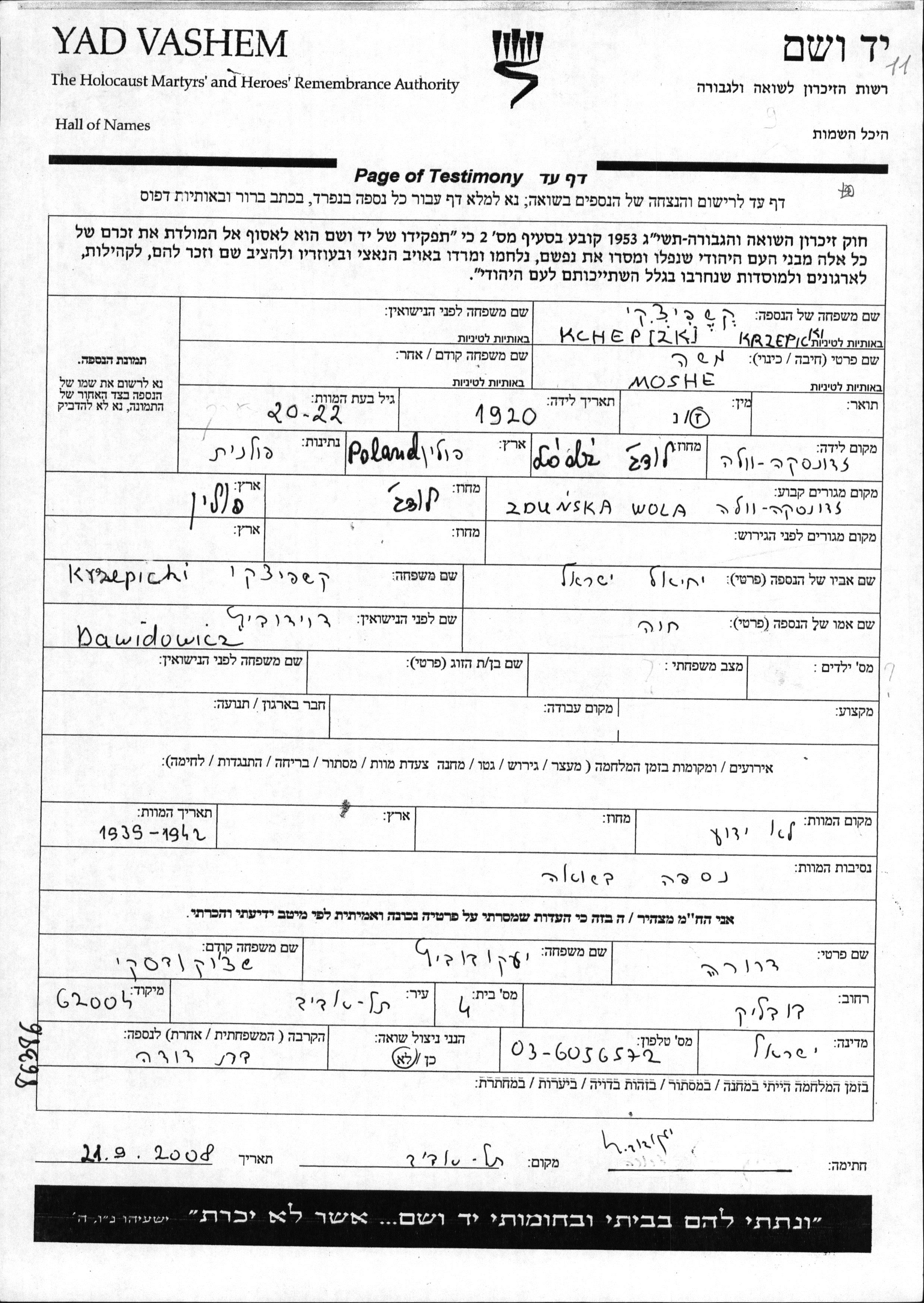 Moshe Krzepicki wurde im Jahr 1920 in Zdunska Wola, Polen geboren. Er war der Sohn von Yekhiel Yisrael und Chaia, geb. Dawidowicz. Vor dem Zweiten Weltkrieg lebte er in Zdunska Wola, Polen.