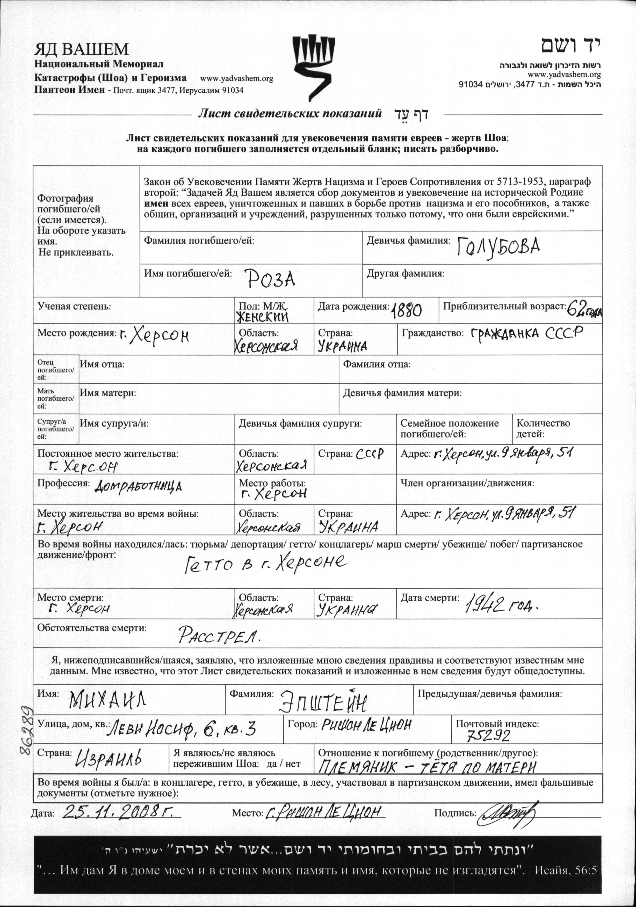 Roza Name unbekannt, geb. Golubova wurde im Jahr 1880 in Kherson, Ukraine (UdSSR) geboren. Sie war Hausfrau. Vor dem Zweiten Weltkrieg lebte sie in Kherson, Ukraine (UdSSR). Während des Krieges war sie in Kherson, Ukraine (UdSSR).
