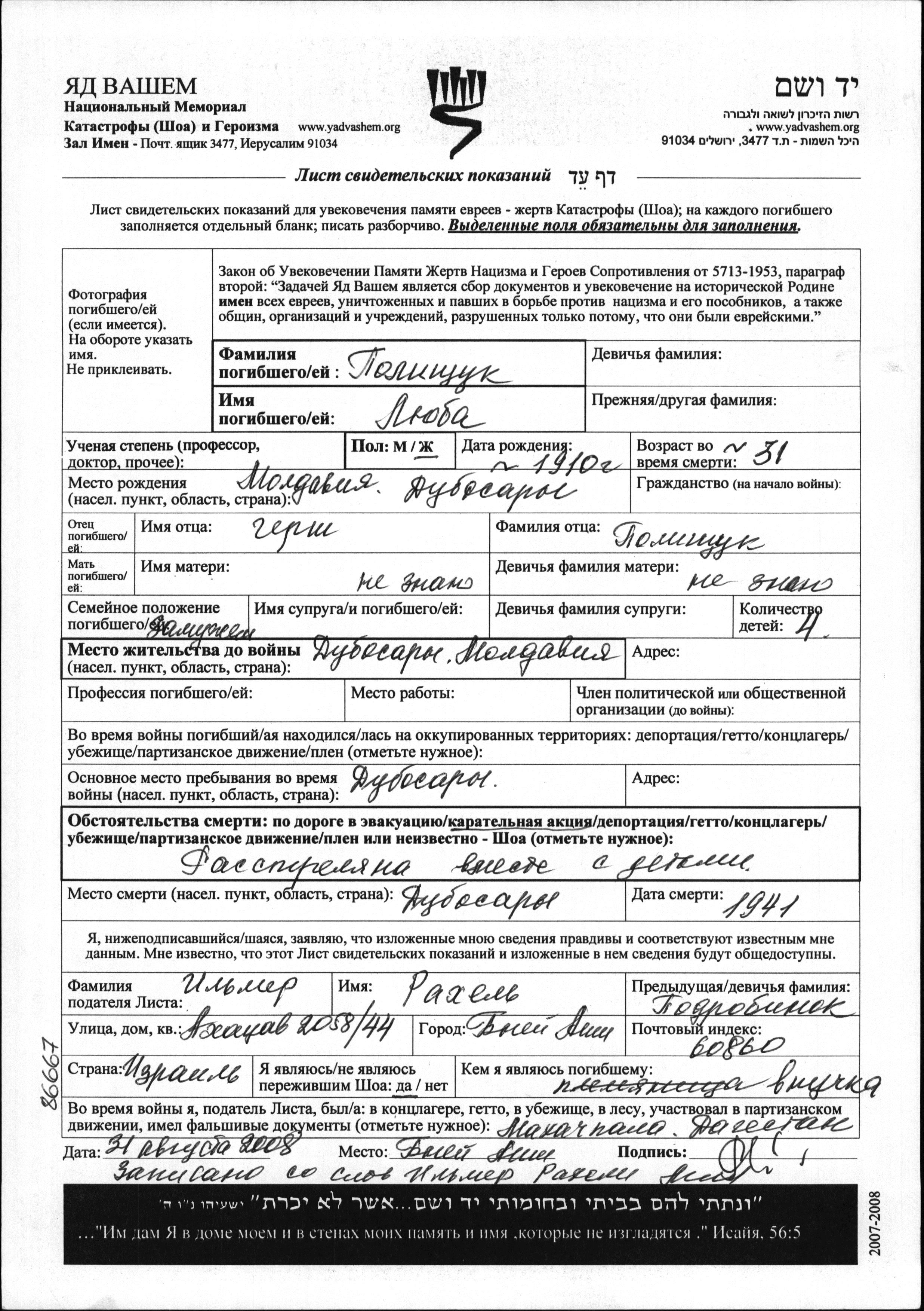 Lyuba Polishchuk wurde im Jahr 1910 in Dubossary, Ukraine (UdSSR) geboren. Sie war die Tochter von Gersh. Sie war Verheiratet. Vor dem Zweiten Weltkrieg lebte sie in Dubossary, Ukraine (UdSSR). Während des Krieges war sie in Dubossary, Ukraine (UdSSR).