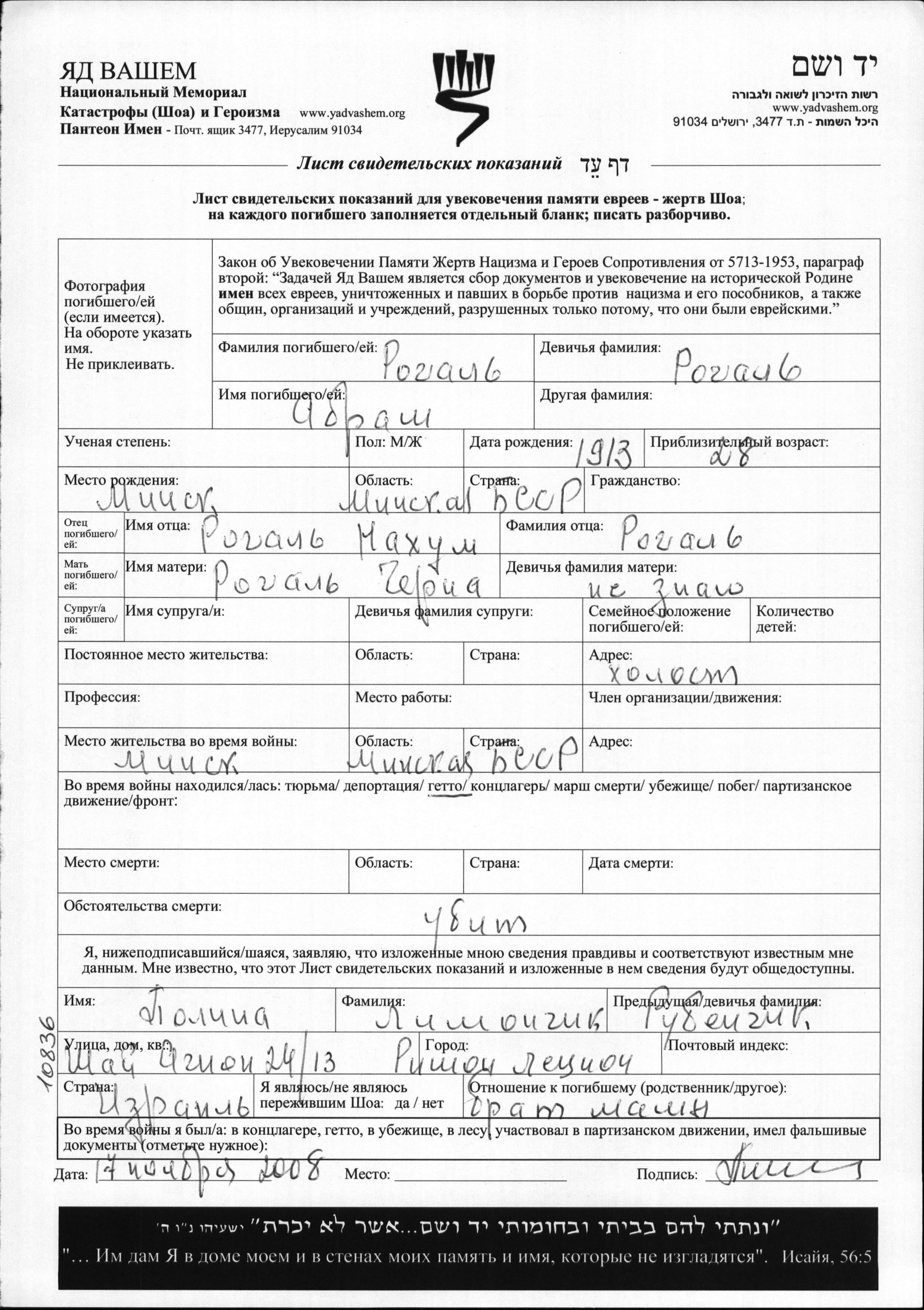 Abram Rogal wurde im Jahr 1913 in Minsk, Weißrussland (UdSSR) geboren. Er war der Sohn von Nakhum und Cherna. Er war Ledig. Vor dem Zweiten Weltkrieg lebte er in Minsk, Weißrussland (UdSSR). Während des Krieges war er in Minsk, Weißrussland (UdSSR).