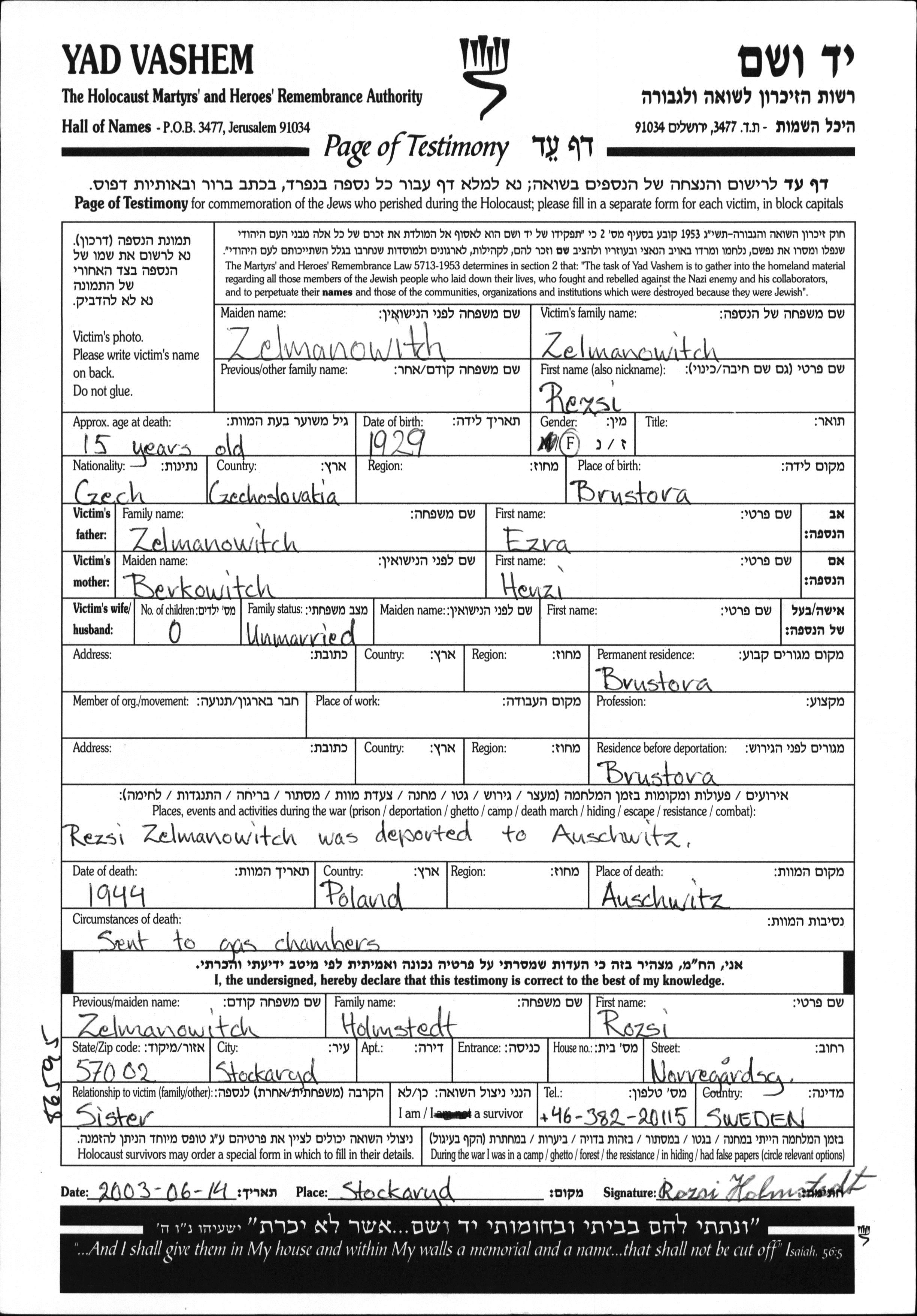 Rezsi Zelmanowitch wurde im Jahr 1929 in Brustov, Tschechoslowakei geboren. Sie war die Tochter von Ezra und Henzi, geb. Berkowitch. Sie war Jugendliche/-r. Vor dem Zweiten Weltkrieg lebte sie in Brustov, Tschechoslowakei. Während des Krieges war sie in Brustov, Tschechoslowakei.