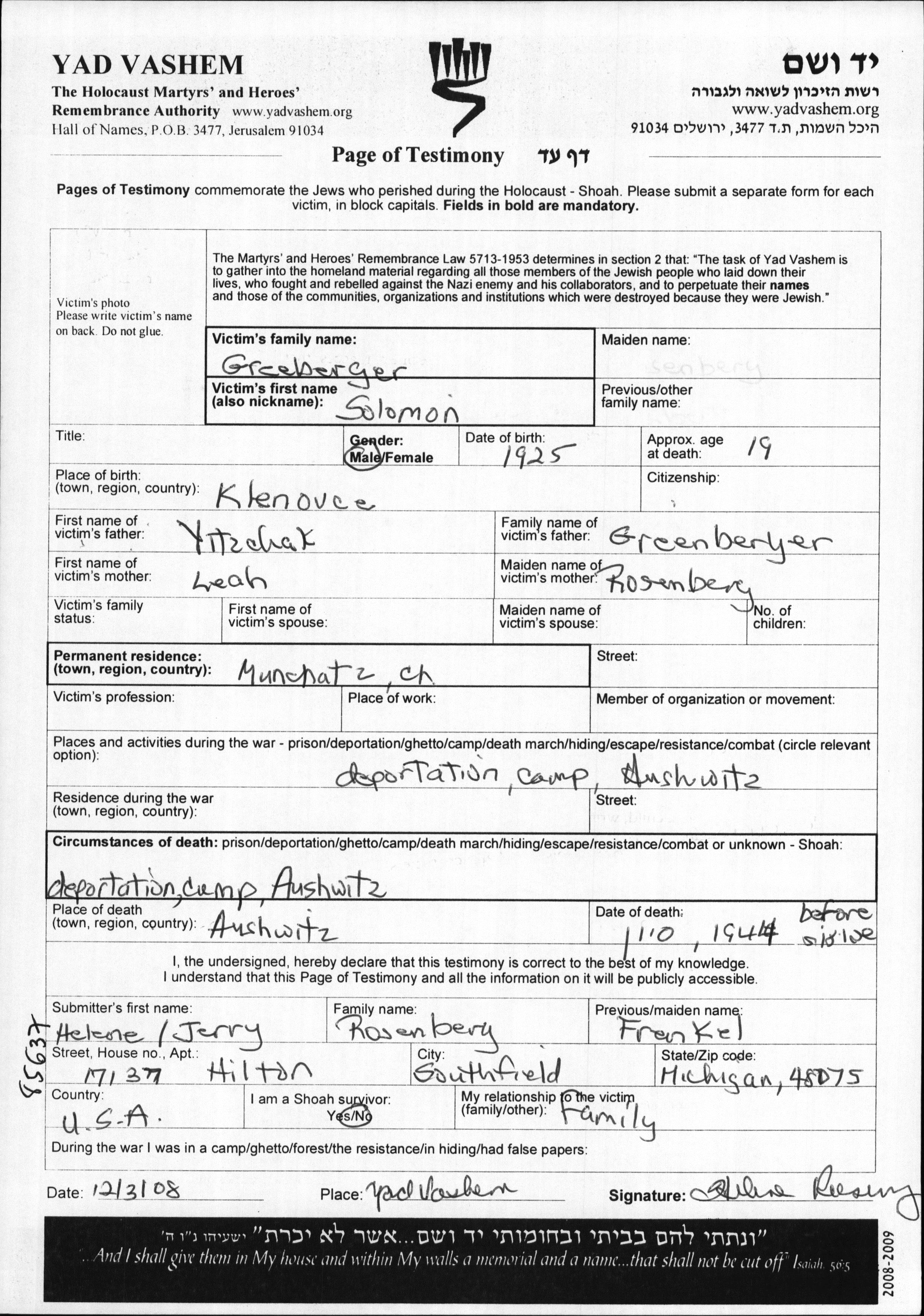 Solomon Greenberger wurde im Jahr 1925 in Klenovci, Tschechoslowakei geboren. Er war der Sohn von Yitzchak und Leah, geb. Rosenberg. Er war Ledig. Vor dem Zweiten Weltkrieg lebte er in Munkacs, Tschechoslowakei. Während des Krieges war er in Munkacs, Tschechoslowakei.
