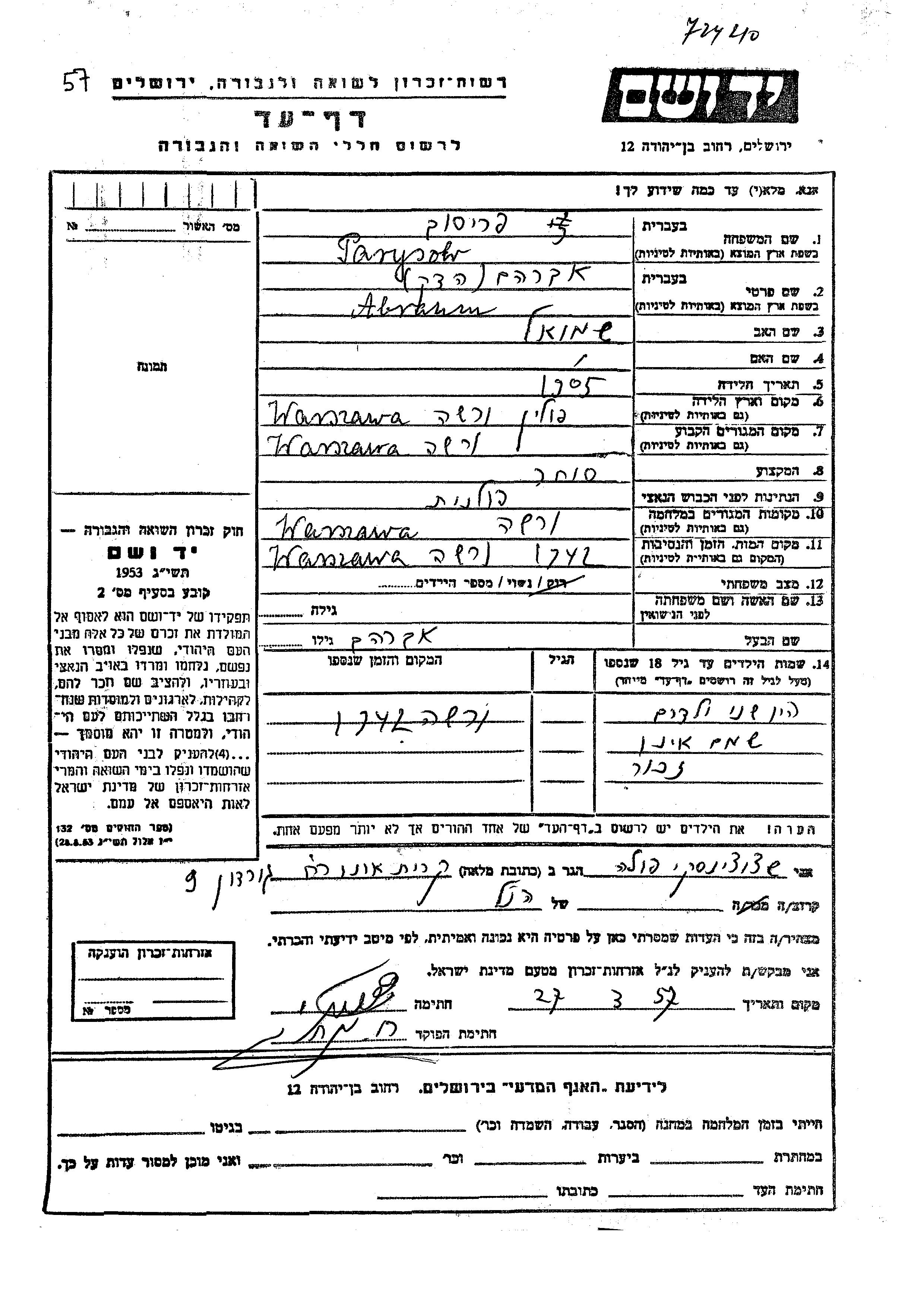 Abraham Hadek Parysow wurde im Jahr 1905 in Varsha, Polen geboren. Er war der Sohn von Shmuel. Er war Kaufmann/-frau und Verheiratet. Vor dem Zweiten Weltkrieg lebte er in Varsha, Polen. Während des Krieges war er in Varsha, Polen.