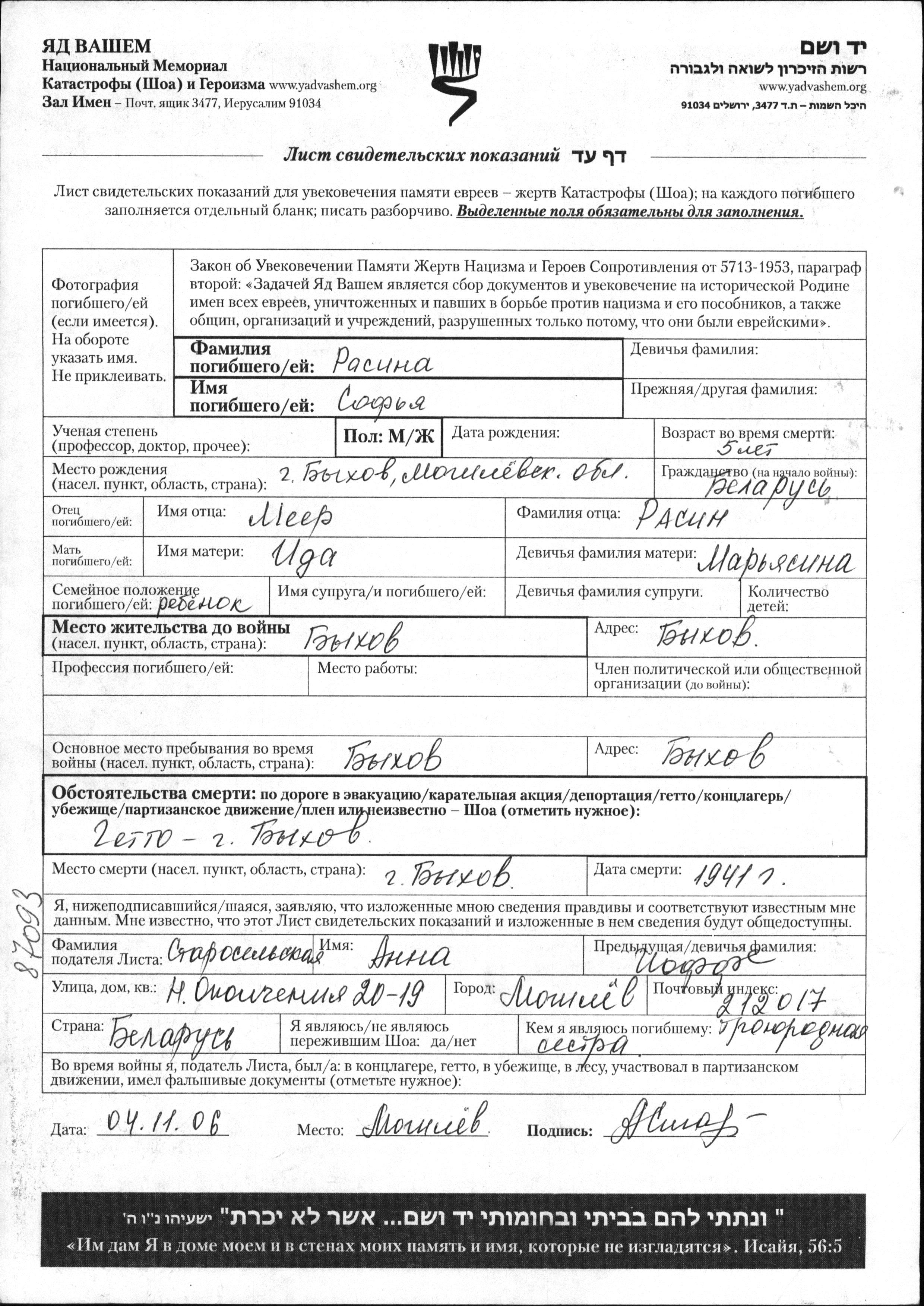 Sofya Rasina wurde in Bykhov, Weißrussland (UdSSR) geboren. Sie war die Tochter von Meyer und Ida, geb. Maryasina. Sie war Kind. Vor dem Zweiten Weltkrieg lebte sie in Bykhov, Weißrussland (UdSSR). Während des Krieges war sie in Bykhov, Weißrussland (UdSSR).