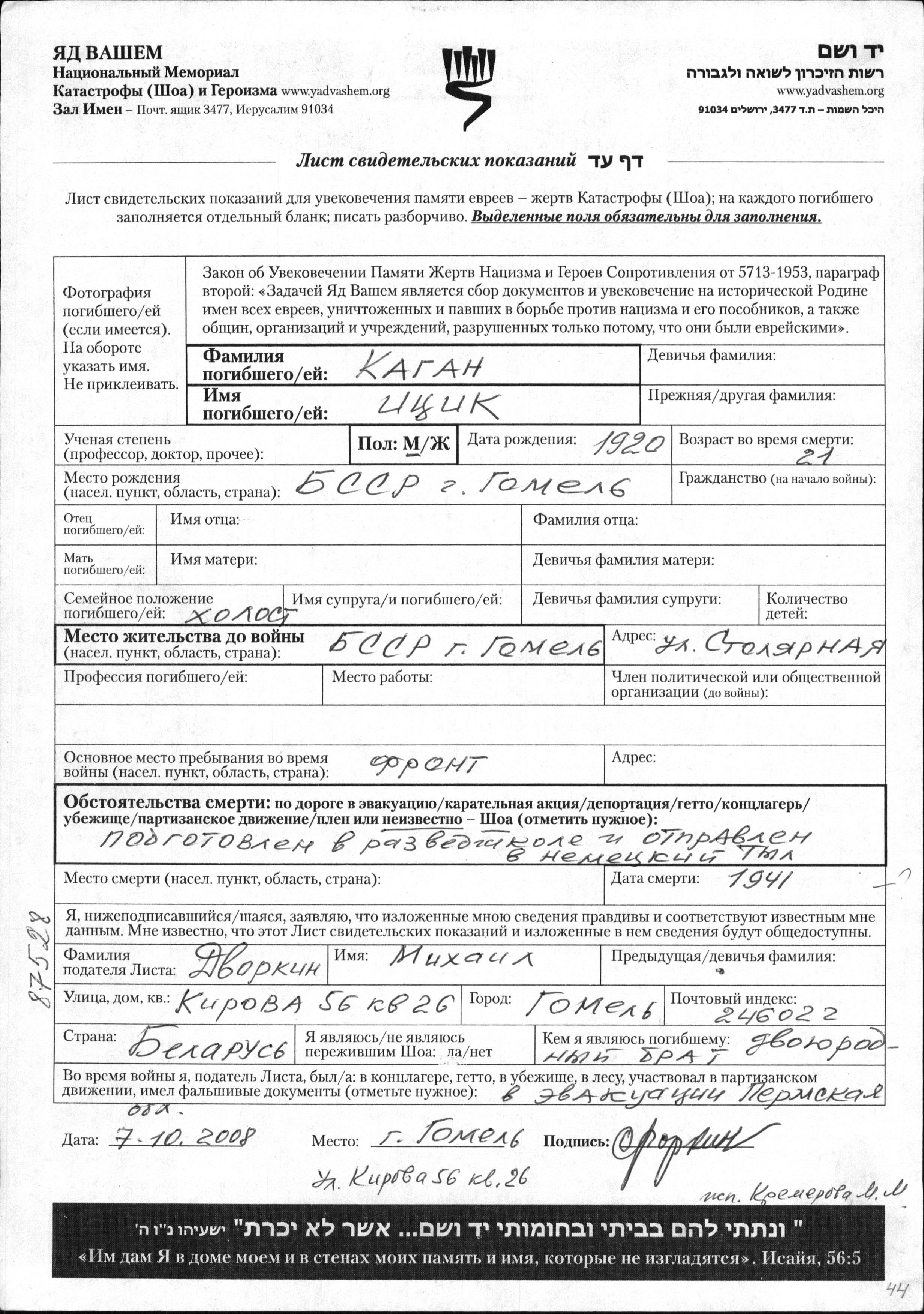 Kagan Itzik 1920 Gomel, Weißrussland (UdSSR) Gedenkblatt