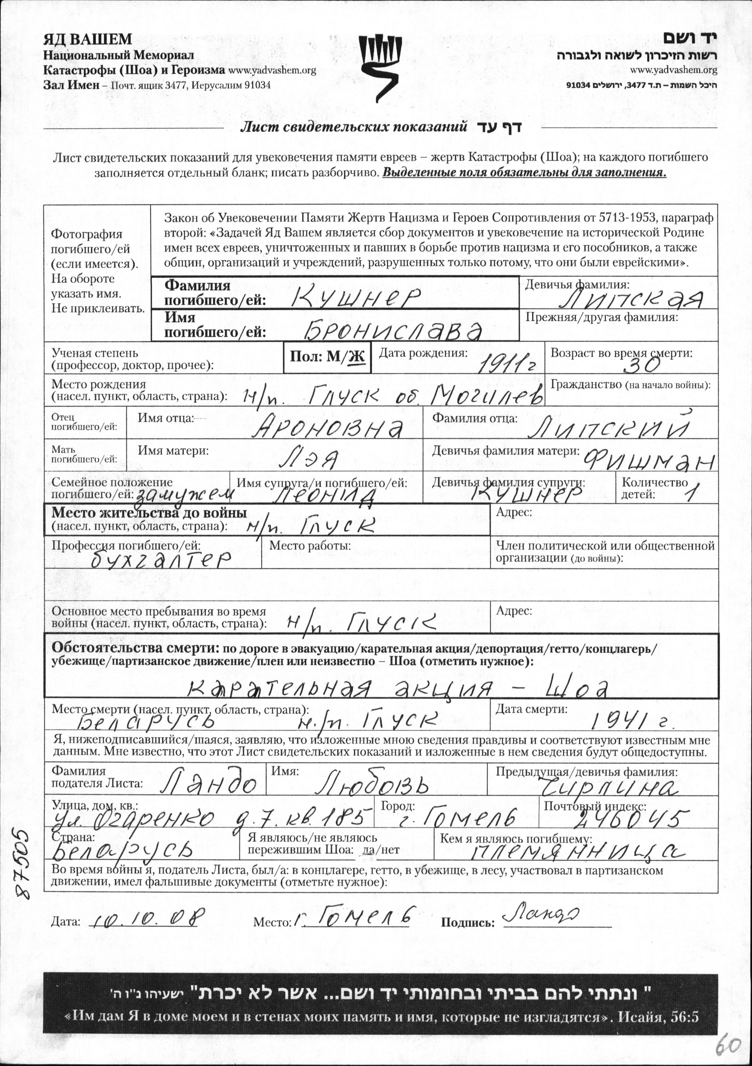 Bronislava Kushner, geb. Lipskaya wurde im Jahr 1911 in Glusk, Weißrussland (UdSSR) geboren. Sie war die Tochter von Aron und Leya, geb. Fishman. Sie war Buchhalter/-in und mit Leonid Verheiratet. Vor dem Zweiten Weltkrieg lebte sie in Glusk, Weißrussland (UdSSR). Während des Krieges war sie in Glusk, Weißrussland (UdSSR).