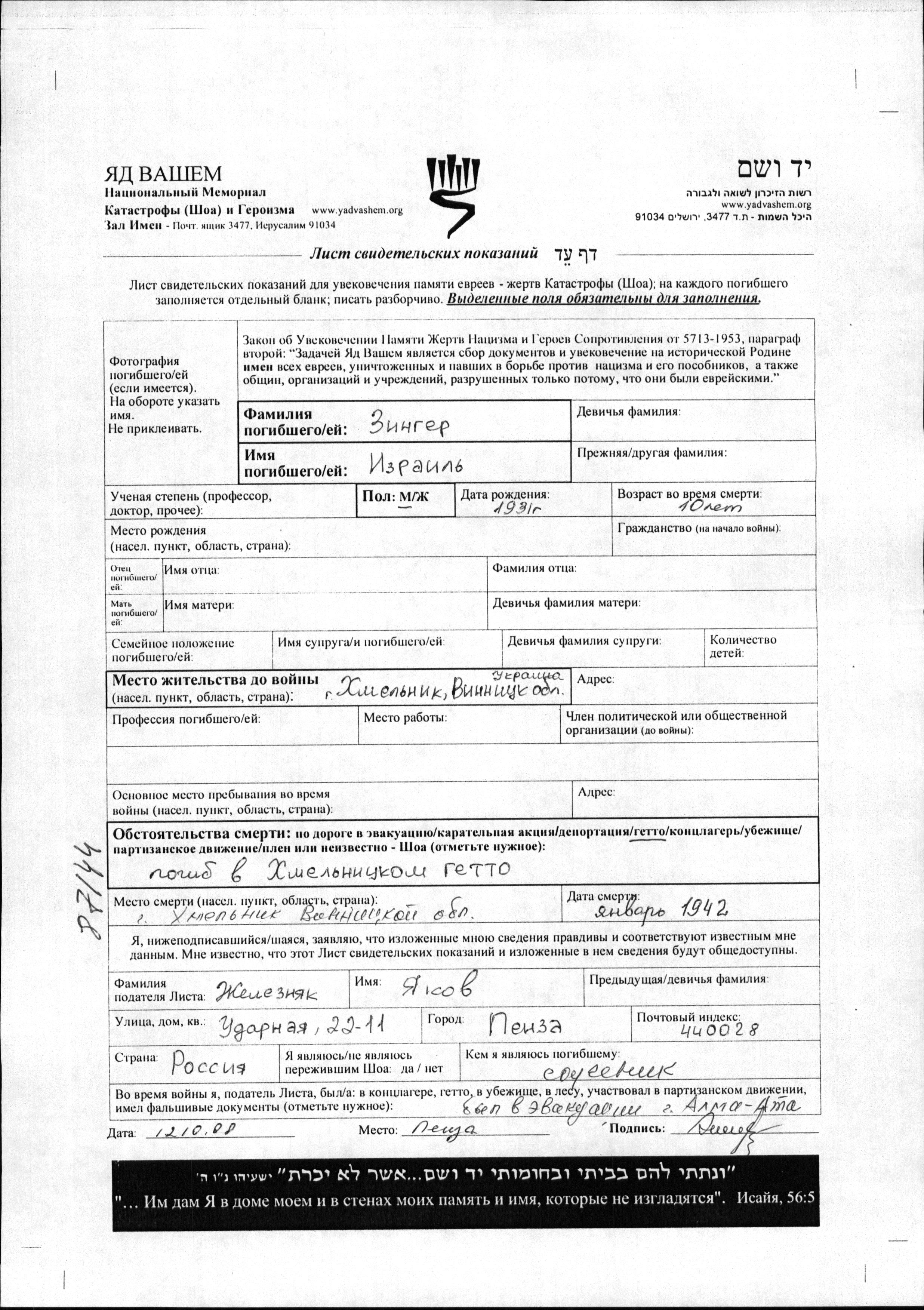 Izrail Zinger wurde im Jahr 1931 geboren. Er war Kind. Vor dem Zweiten Weltkrieg lebte er in Khmelnik, Ukraine (UdSSR). Während des Krieges war er in Khmelnik, Ukraine (UdSSR).