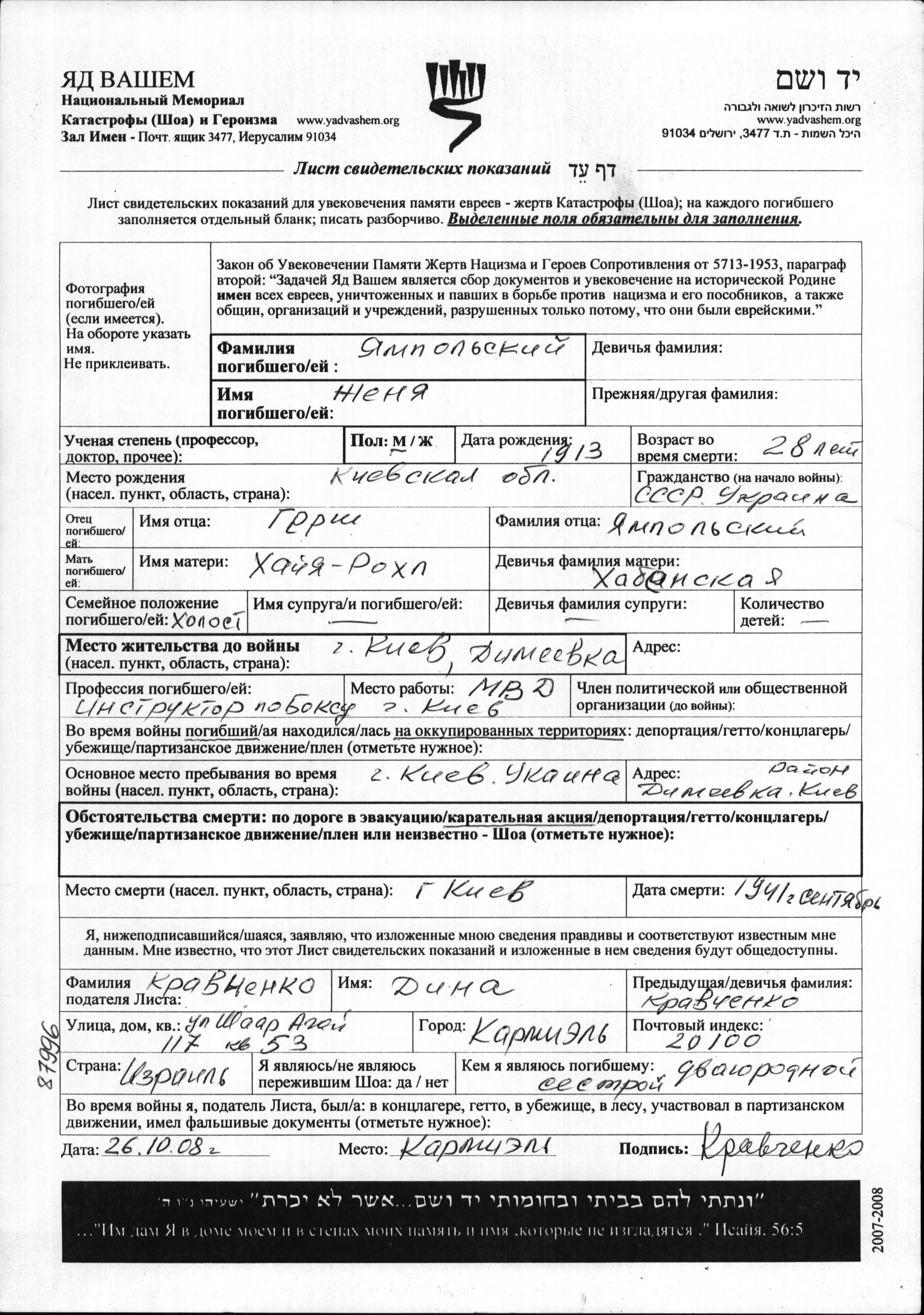 Zhenya Yampolski wurde im Jahr 1913 in Kiev, Ukraine (UdSSR) geboren. Er war der Sohn von Gersh und Khaya Rokhl, geb. Khabenskaya. Er war Trener und Ledig. Vor dem Zweiten Weltkrieg lebte er in Kiev, Ukraine (UdSSR). Während des Krieges war er in Kiev, Ukraine (UdSSR).