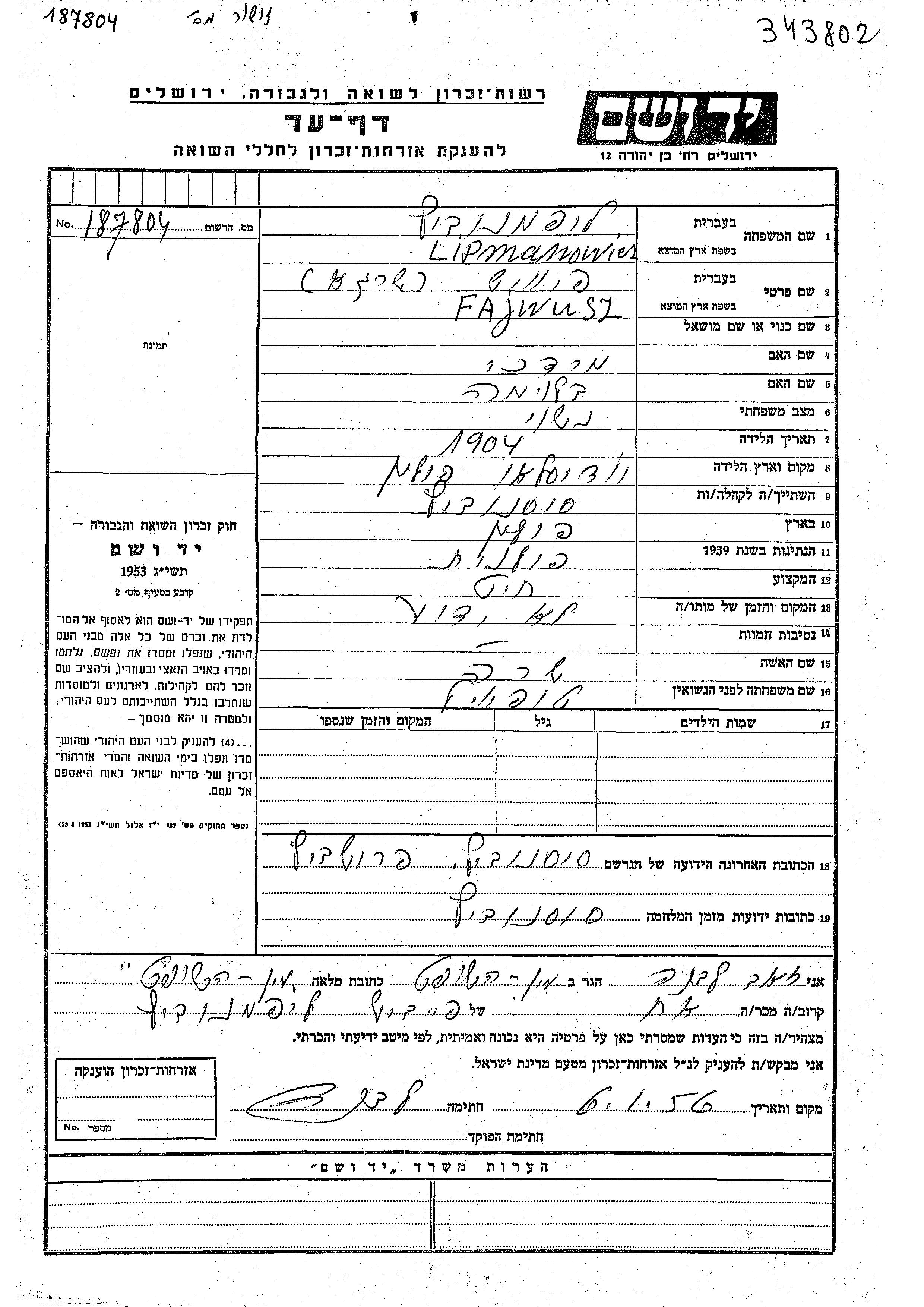 Fajwusz Shraga Lipmanowicz wurde im Jahr 1904 in Wodzislaw, Polen geboren. Er war der Sohn von Mordekhai und Bluma. Er war Schneider. Vor dem Zweiten Weltkrieg lebte er in Sosnowiec, Polen. Während des Krieges war er in Sosnowiec, Polen.