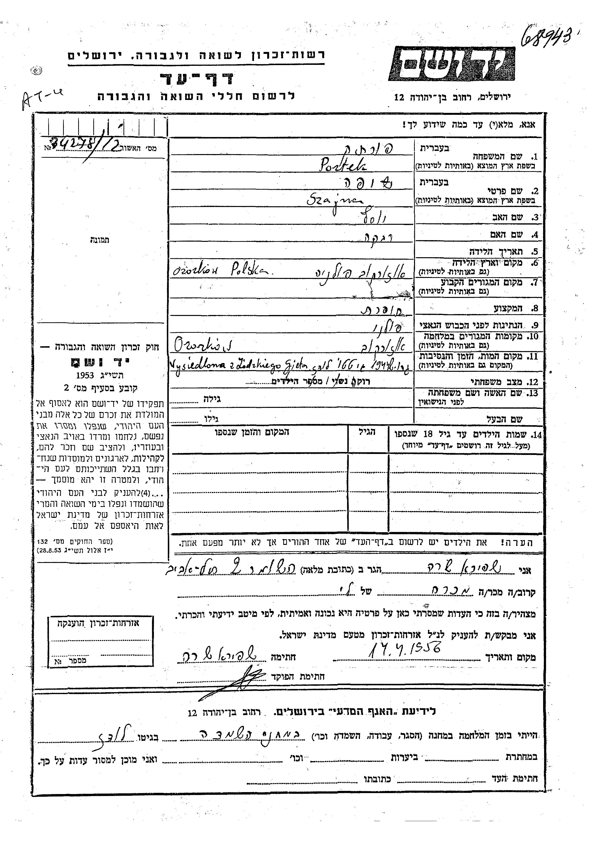 Szajna Shipa Portek wurde in Ozorkow, Polen geboren. Sie war die Tochter von Yosef und Rivka. Sie war Schneiderin und Ledig. Während des Krieges war sie in Ozorkow, Polen.