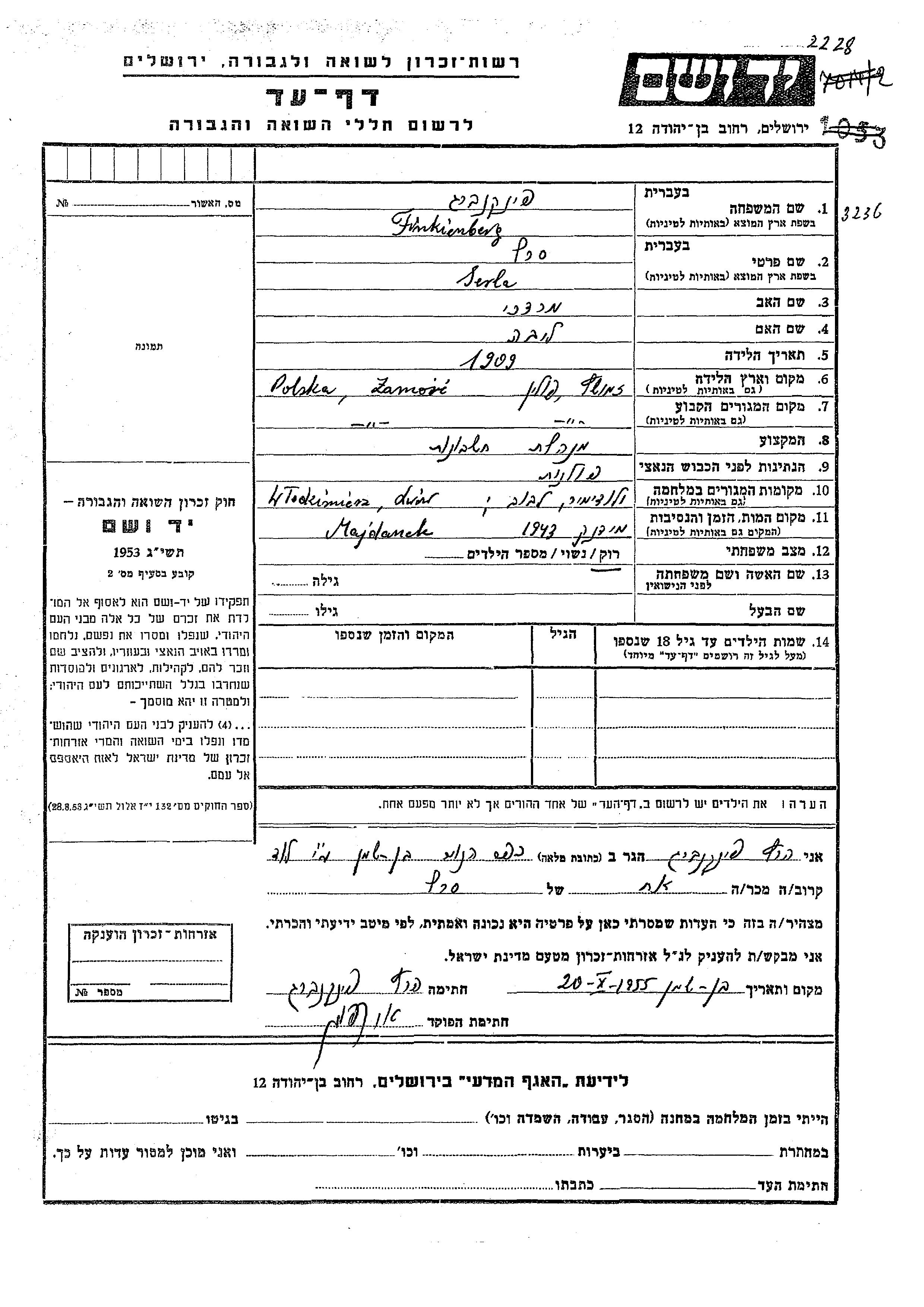 Serla Finkienberg wurde im Jahr 1909 in Zamosc, Polen geboren. Sie war die Tochter von Mordekhai und Luba. Sie war Buchhalter/-in und Ledig. Vor dem Zweiten Weltkrieg lebte sie in Zamosc, Polen. Während des Krieges war sie in Lwow, Polen.
