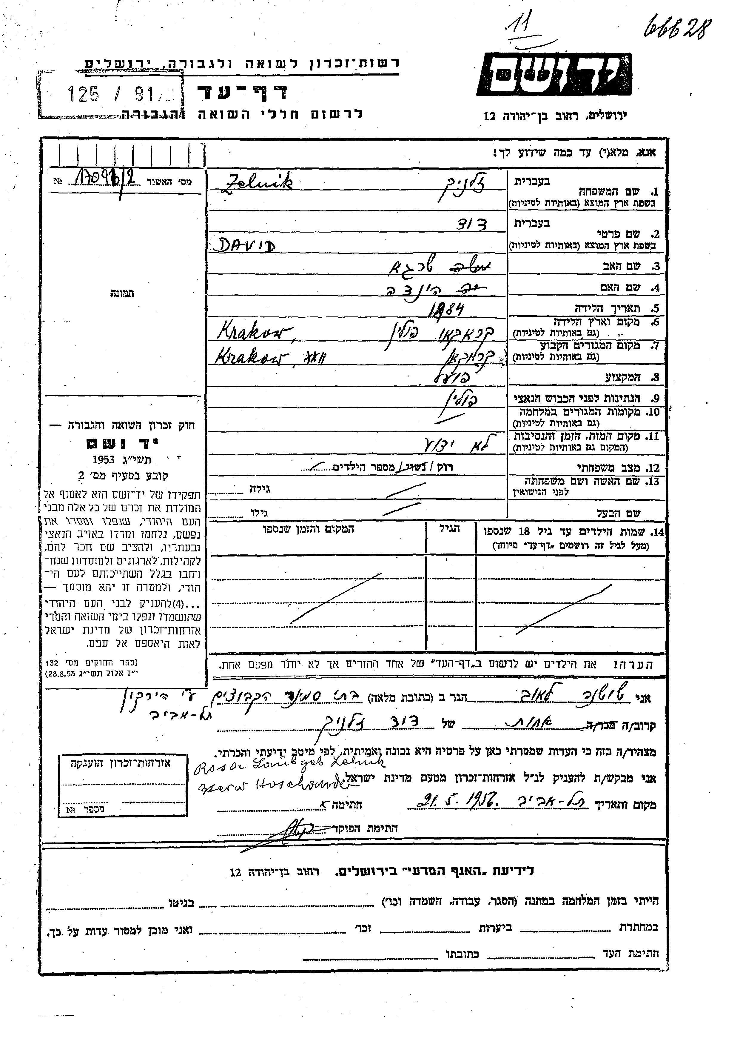 David Zelnik wurde im Jahr 1884 in Krakow, Polen geboren. Er war der Sohn von Shraga und Hinda. Er war Arbeiter/-in und Ledig. Vor dem Zweiten Weltkrieg lebte er in Krakow, Polen.