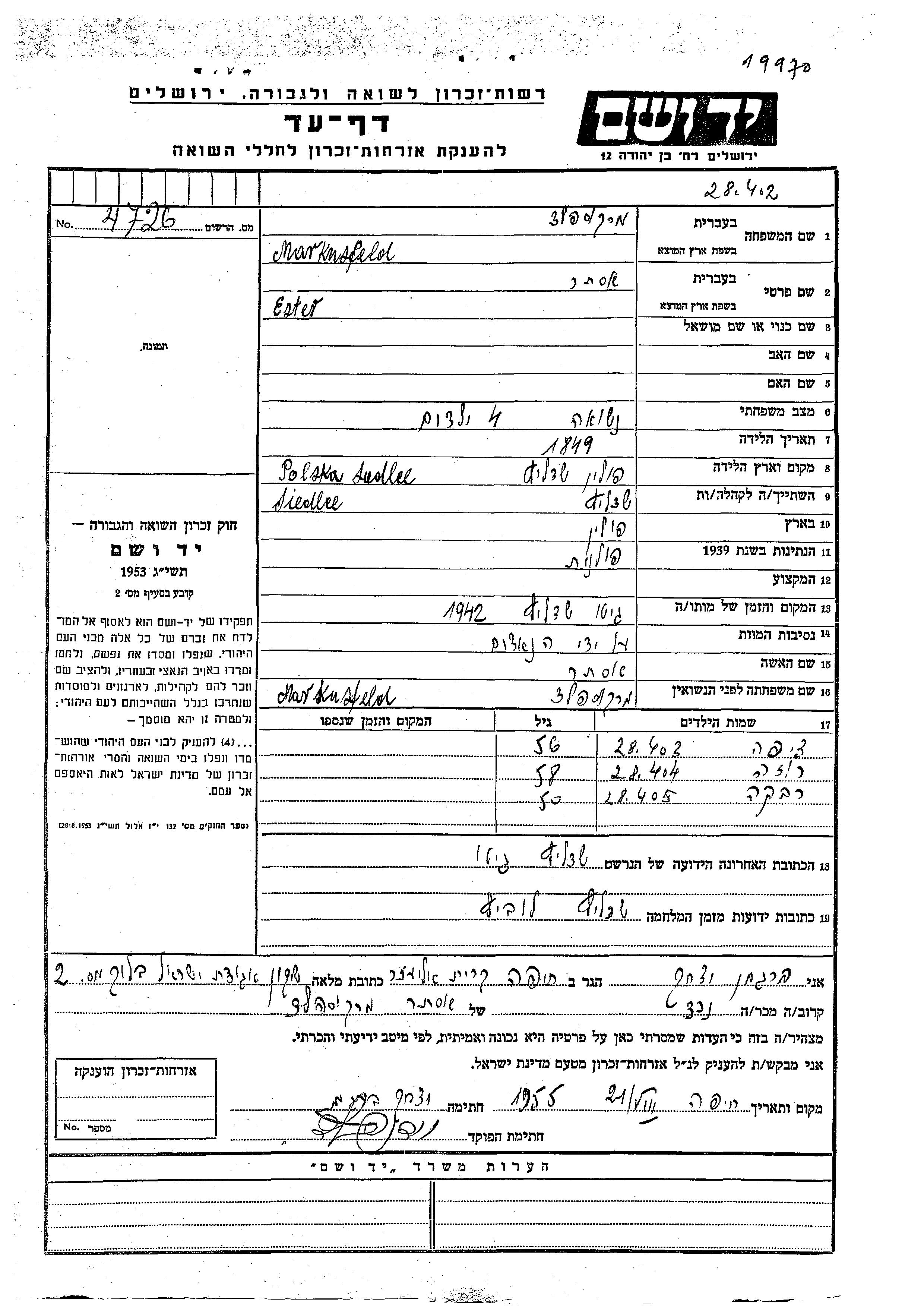 Ester Markusfeld wurde im Jahr 1849 in Siedlce, Polen geboren. Sie war Verheiratet. Vor dem Zweiten Weltkrieg lebte sie in Siedlce, Polen. Während des Krieges war sie in Siedlce, Polen.