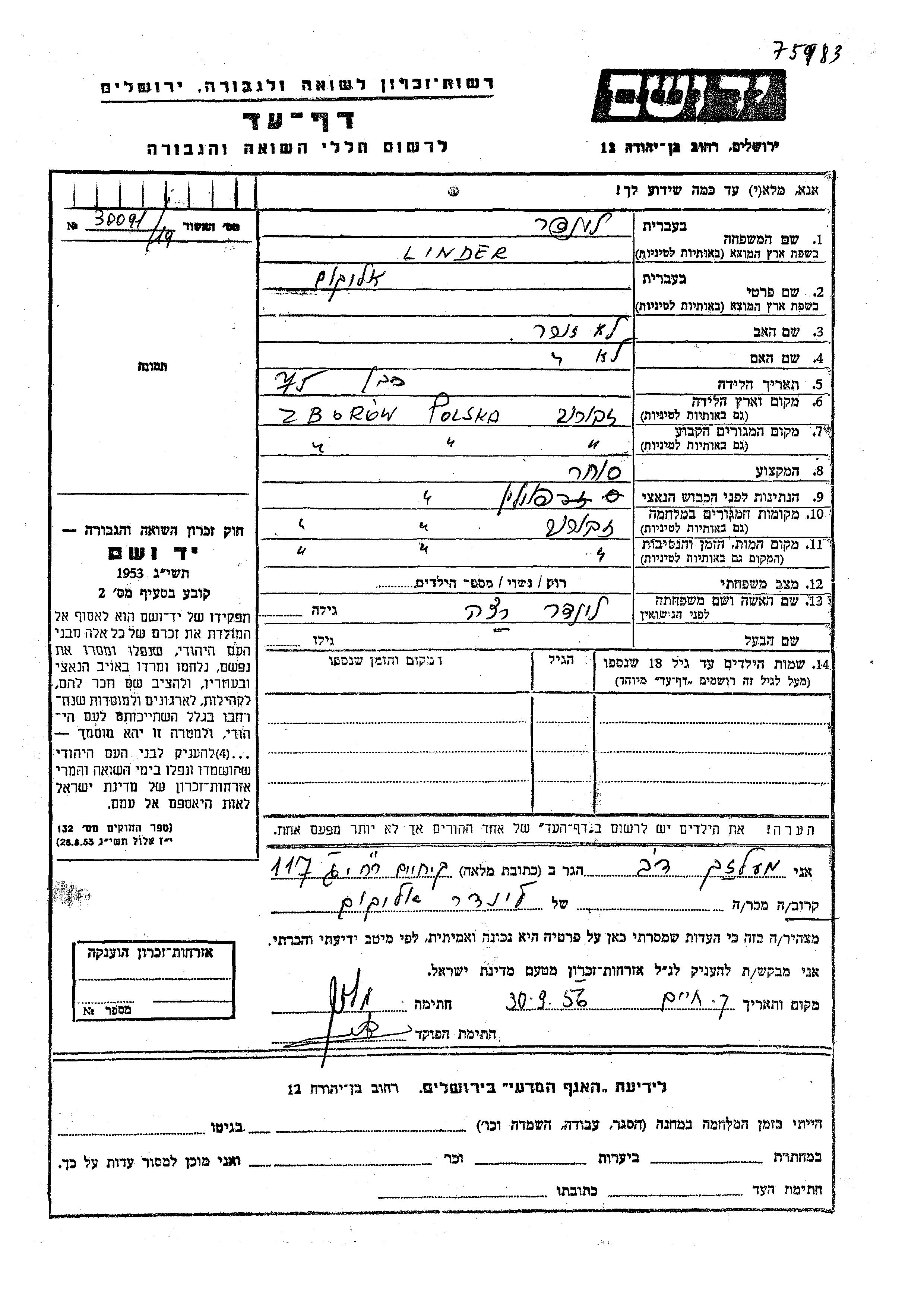 Eliakim Linder wurde in Zborow, Polen geboren. Er war Kaufmann/-frau. Vor dem Zweiten Weltkrieg lebte er in Zborow, Polen. Während des Krieges war er in Zborow, Polen.