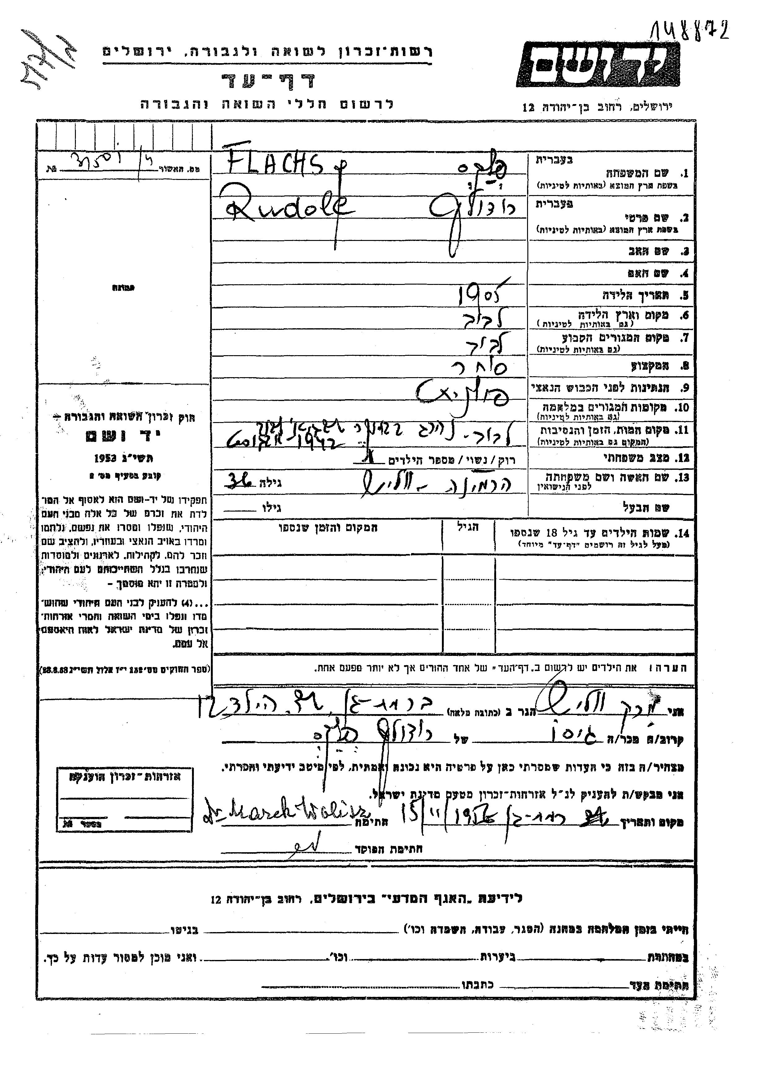 Rudolf Flachs wurde im Jahr 1905 in Lwow, Polen geboren. Er war Kaufmann/-frau und mit Hermina, geb. Volish Verheiratet. Vor dem Zweiten Weltkrieg lebte er in Lwow, Polen. Während des Krieges war er in Lwow, Polen.