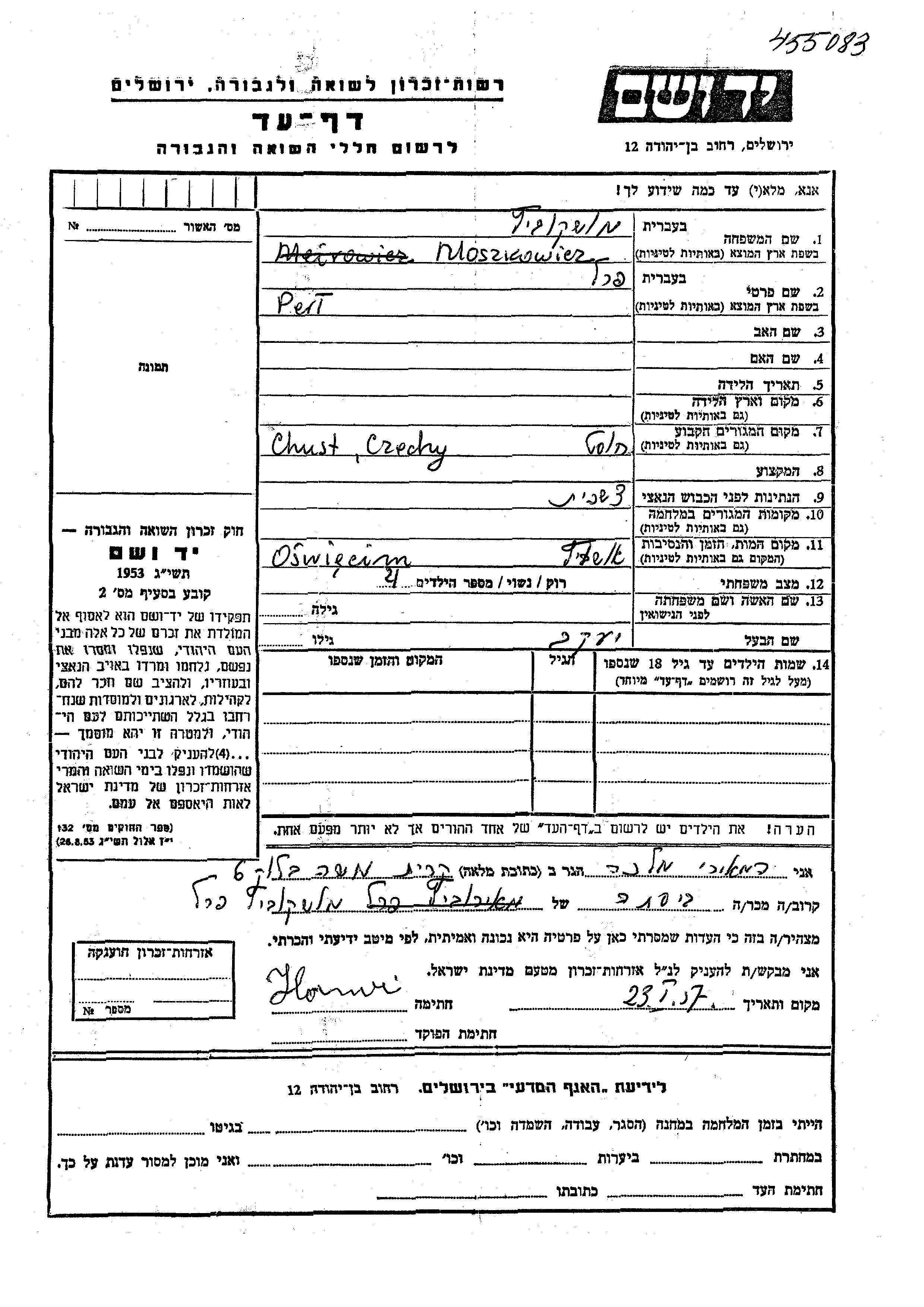 Moszkowicz Perl Chust, Tschechoslowakei Gedenkblatt