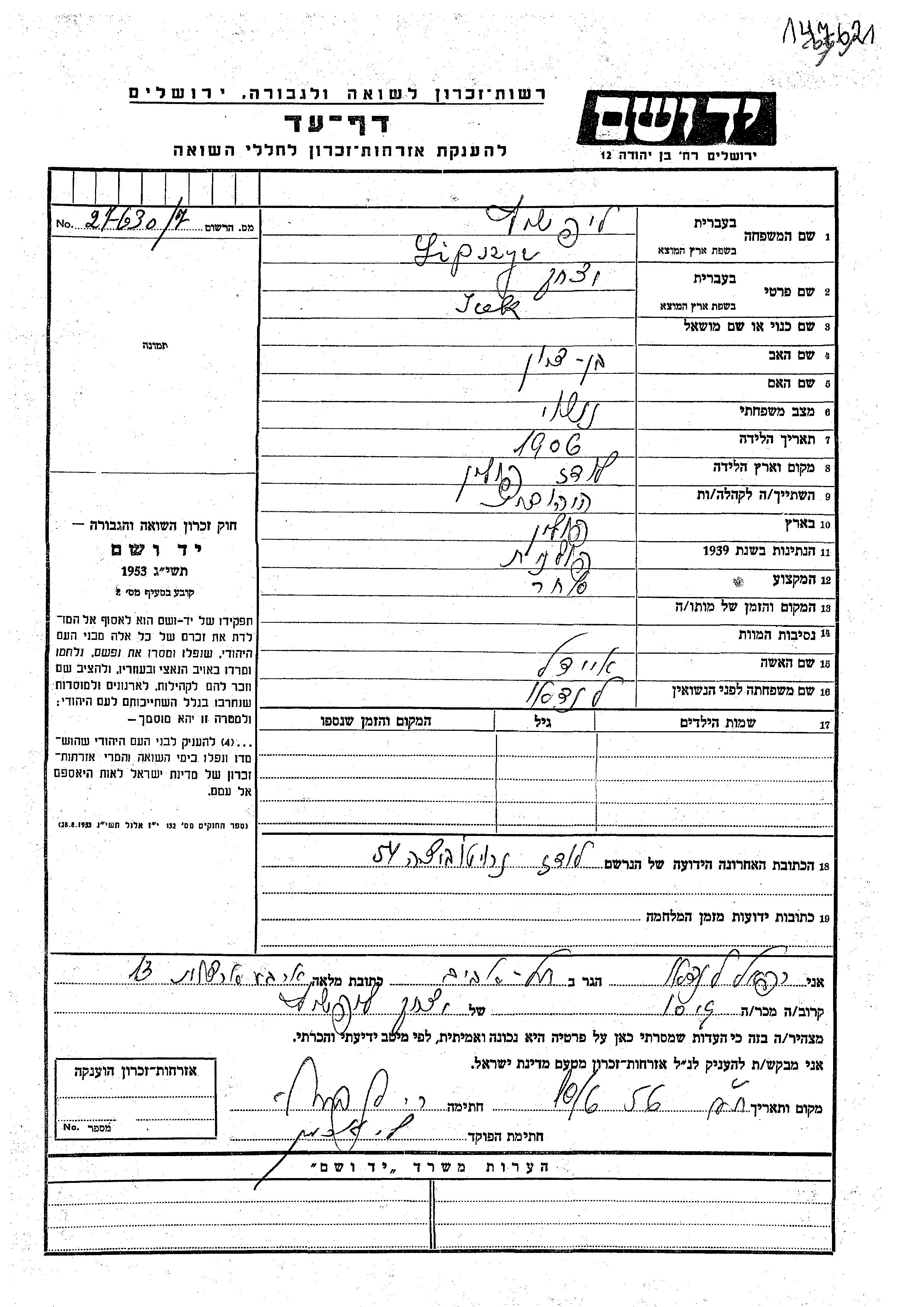 Ycek Lipszyc wurde im Jahr 1906 in Lodz, Polen geboren. Er war der Sohn von Bentzion. Er war Kaufmann/-frau.