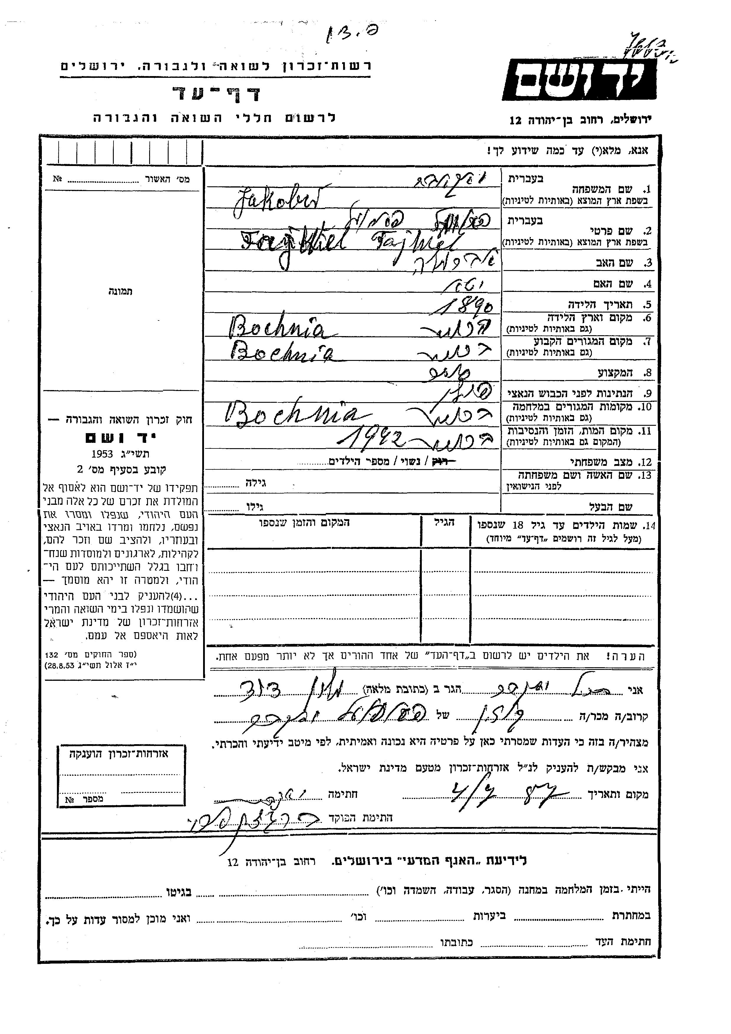 Fajwel wurde in der Schoah ermordet. Todesort: Bochnia, Polen im Jahr 1942.