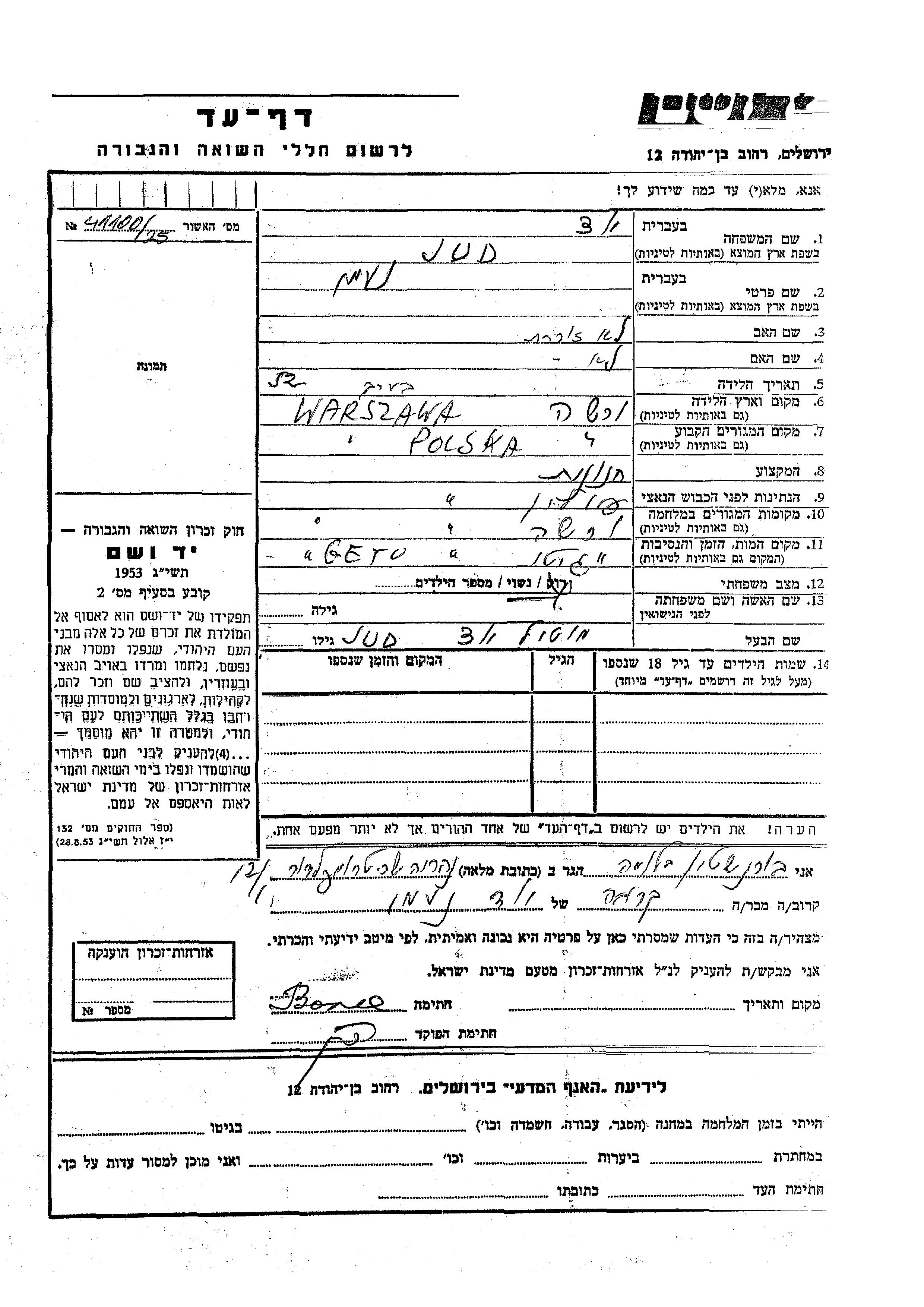 Naaman Jud wurde in Warsaw, Polen geboren. Er war Lebensmittelhändler/-in und mit Motil Verheiratet. Vor dem Zweiten Weltkrieg lebte er in Warsaw, Polen. Während des Krieges war er in Warsaw, Polen.