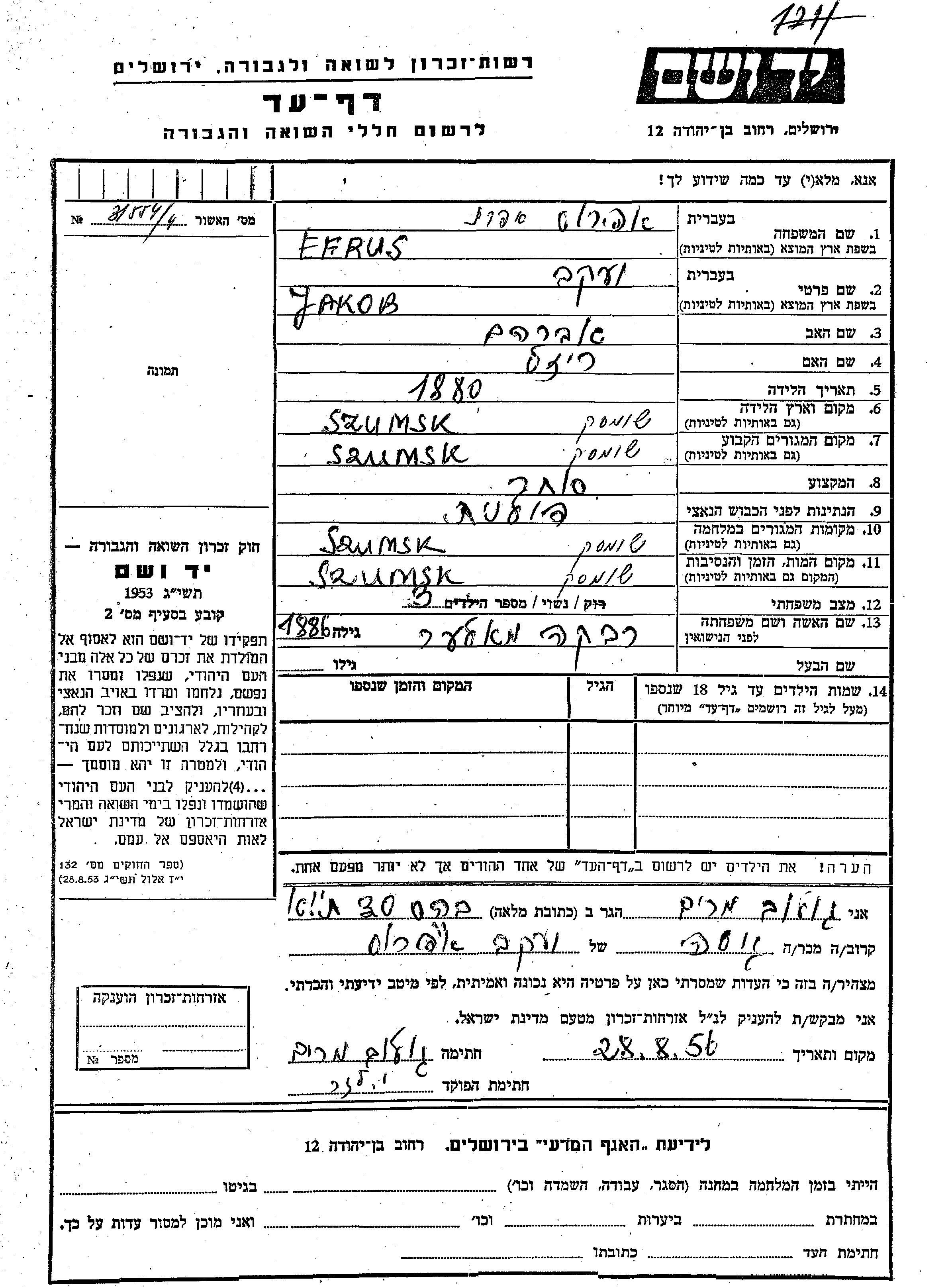 Yakob wurde in der Schoah ermordet. Todesort: Szumsk, Polen.