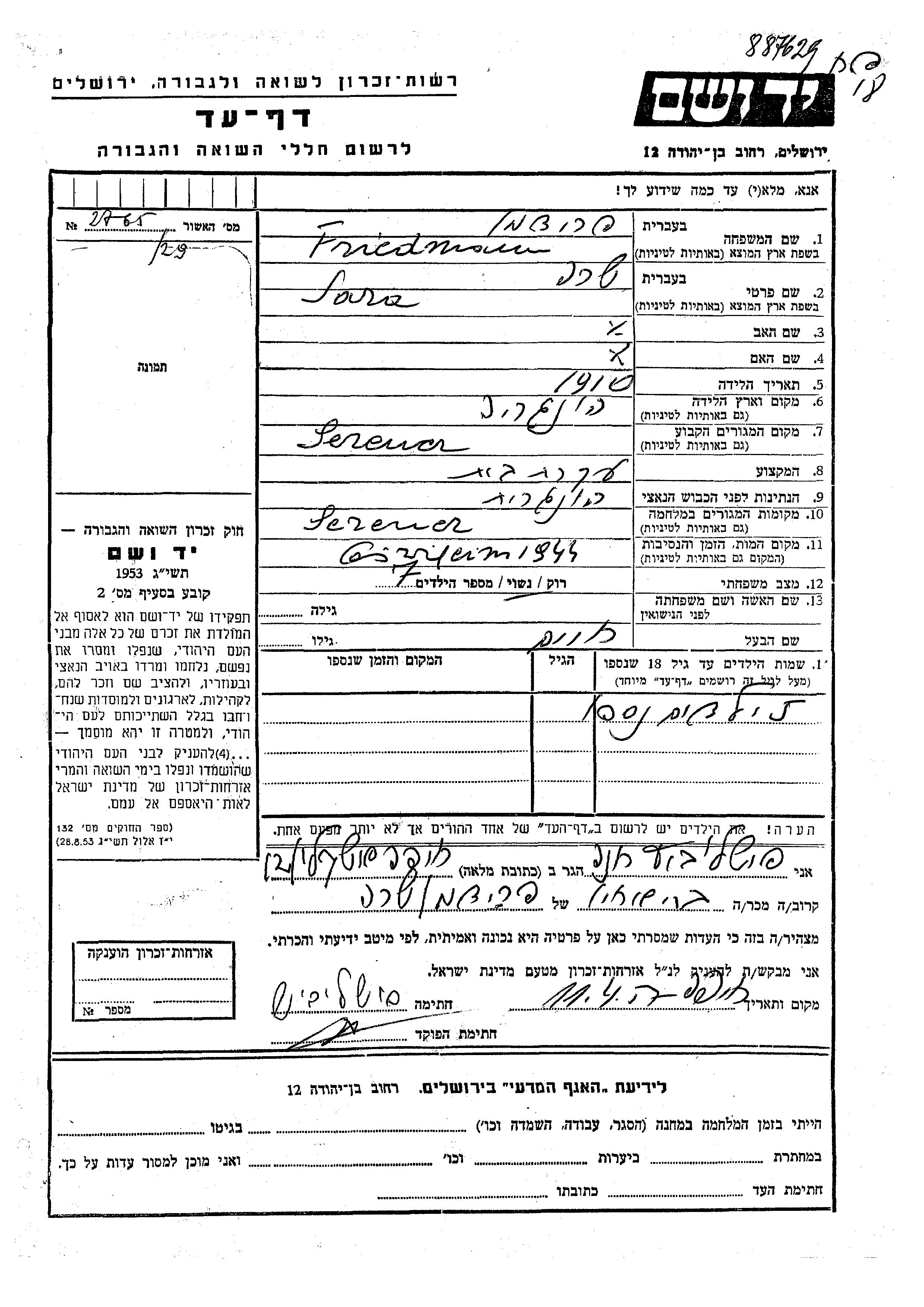 Friedmann Sara 1910 Serencs, Ungarn Gedenkblatt