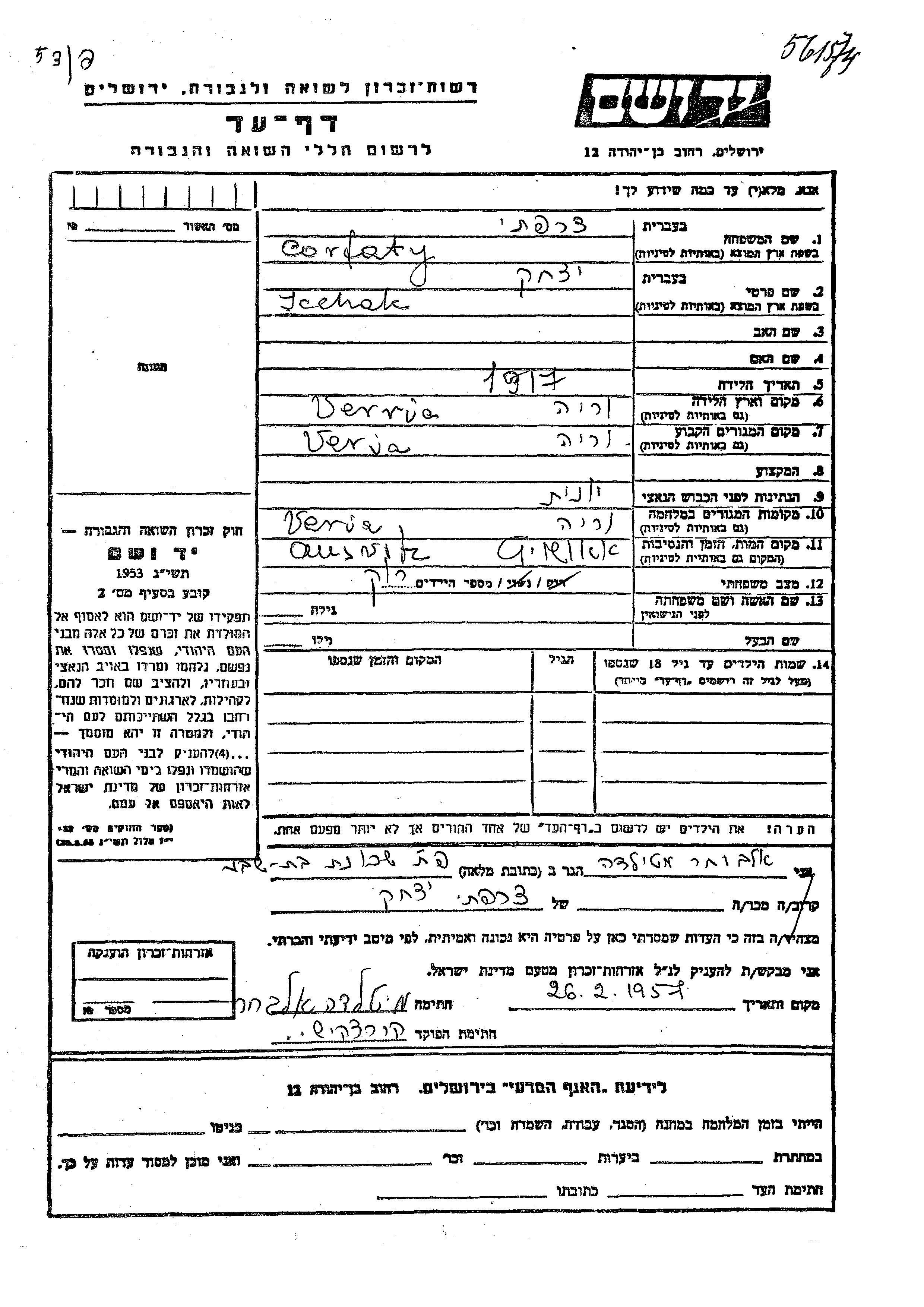 Ycchak Corfaty wurde im Jahr 1917 in Verria, Griechenland geboren. Er war Ledig. Vor dem Zweiten Weltkrieg lebte er in Verria, Griechenland. Während des Krieges war er in Verria, Griechenland.