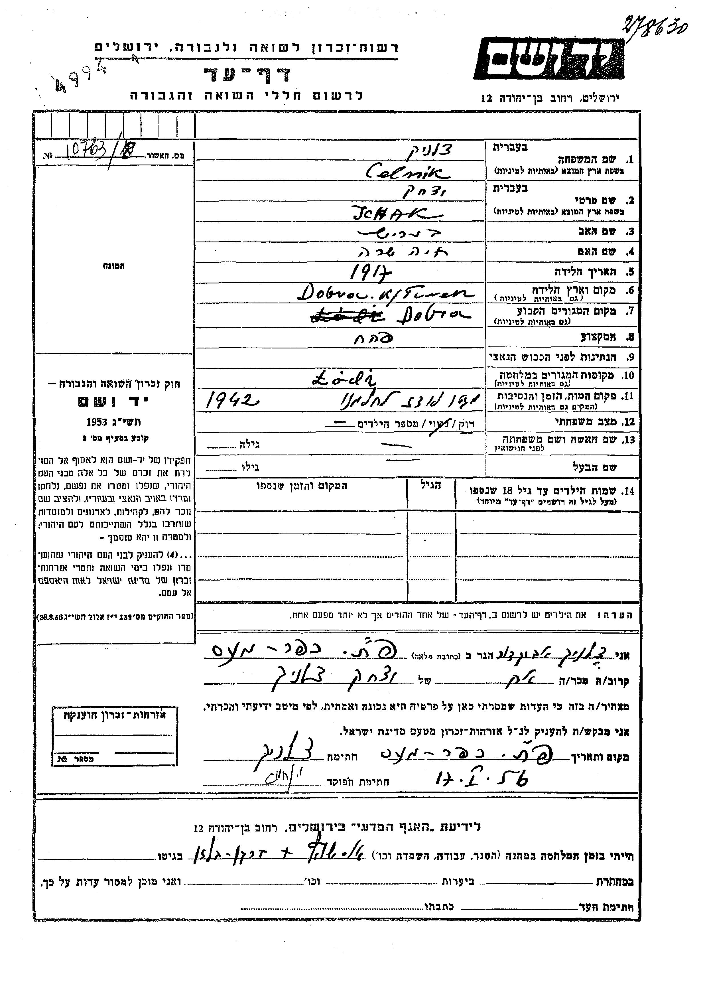 Jchak Celnik wurde im Jahr 1917 in Dobra, Polen geboren. Er war der Sohn von Berish und Khaia Sara. Er war Blechschmied und Ledig. Vor dem Zweiten Weltkrieg lebte er in Dobra, Polen. Während des Krieges war er in Lodz, Polen.