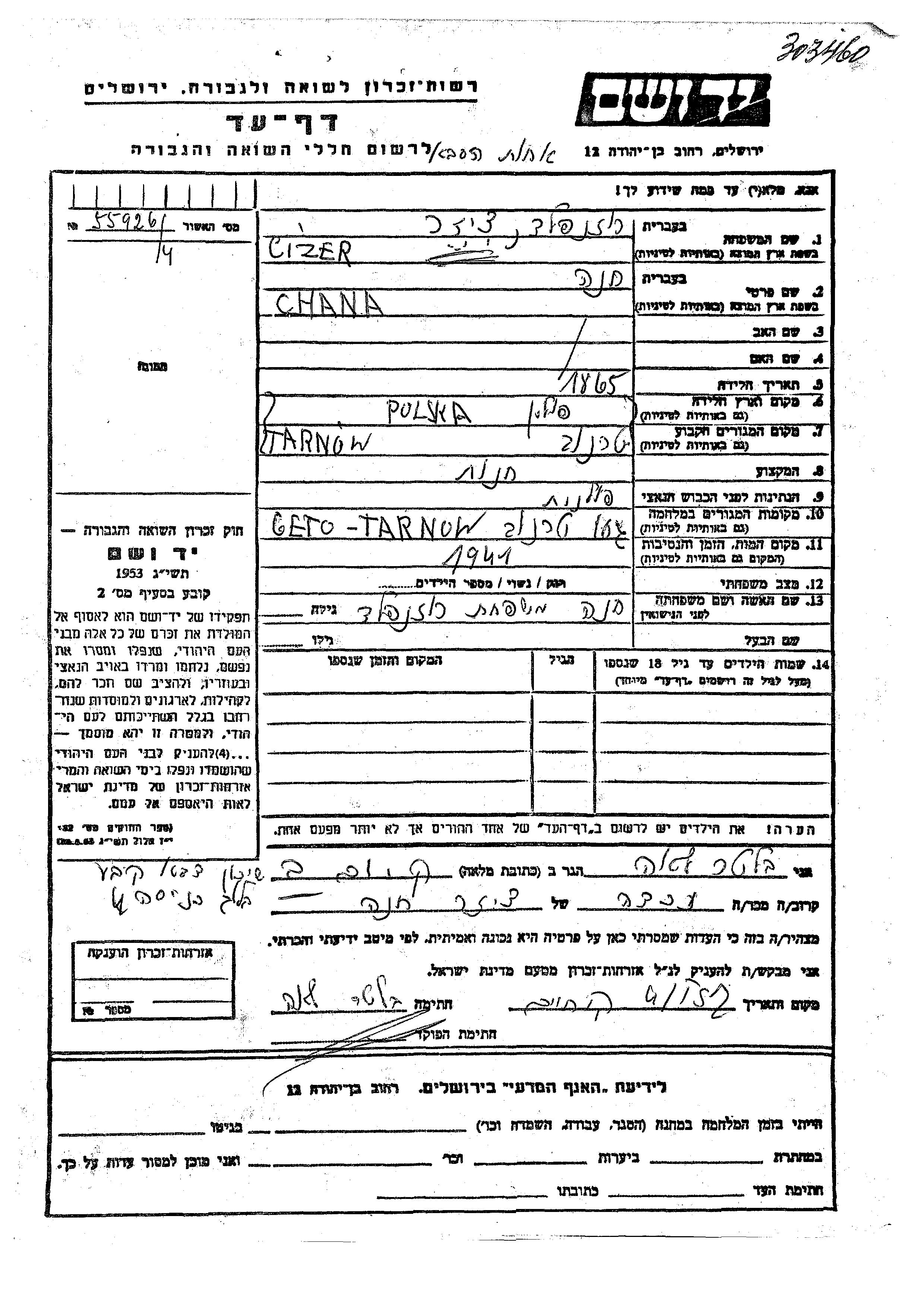 Chana wurde in der Schoah ermordet. Todesort: Tarnow, Polen im Jahr 1941.