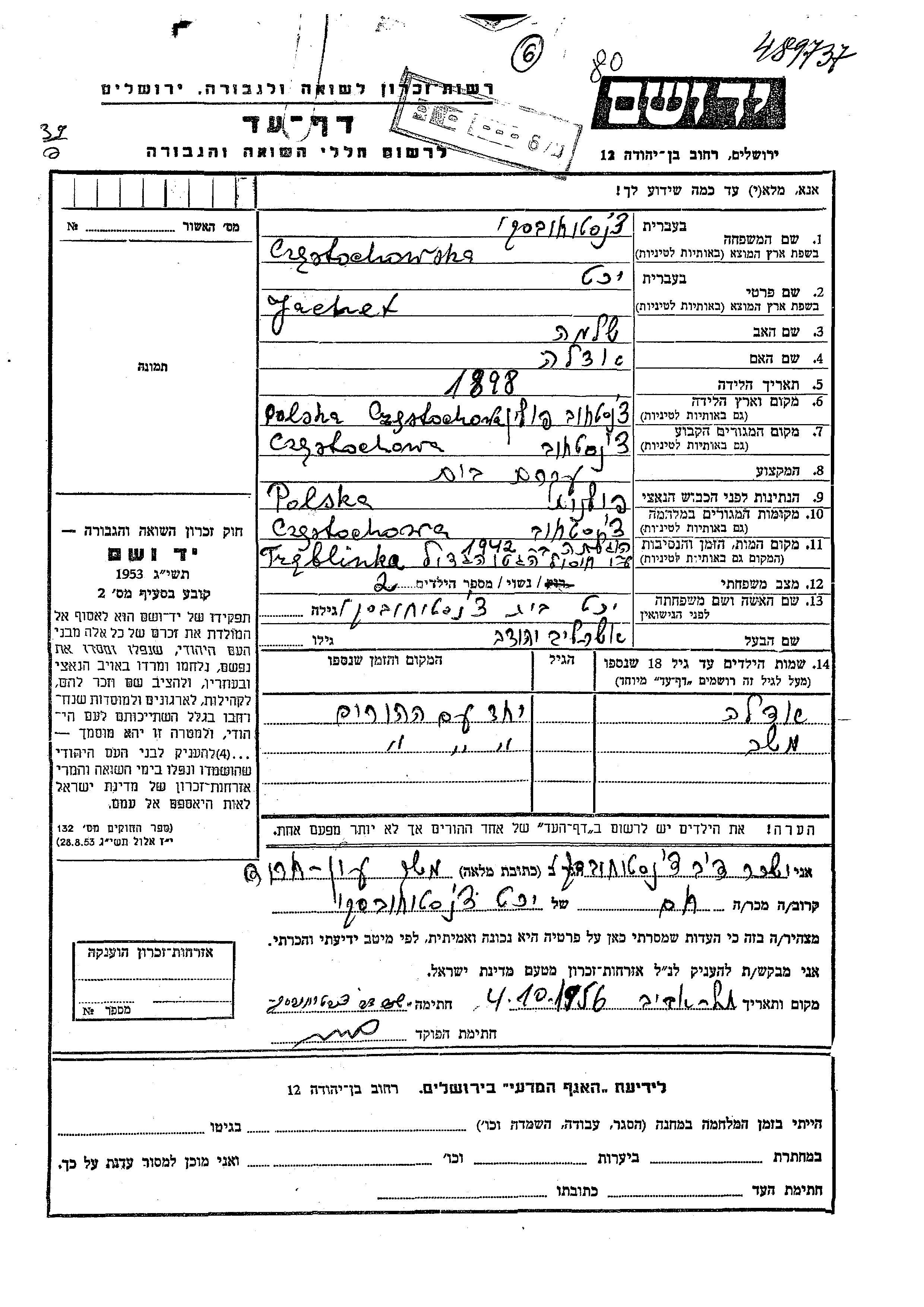 Jachet Czestochowska, geb. Czestochowska wurde im Jahr 1898 in Czestochowa, Polen geboren. Sie war die Tochter von Shlomo und Adela. Sie war Hausfrau und mit Asher Leib Verheiratet. Vor dem Zweiten Weltkrieg lebte sie in Czestochowa, Polen. Während des Krieges war sie in Czestochowa, Polen.