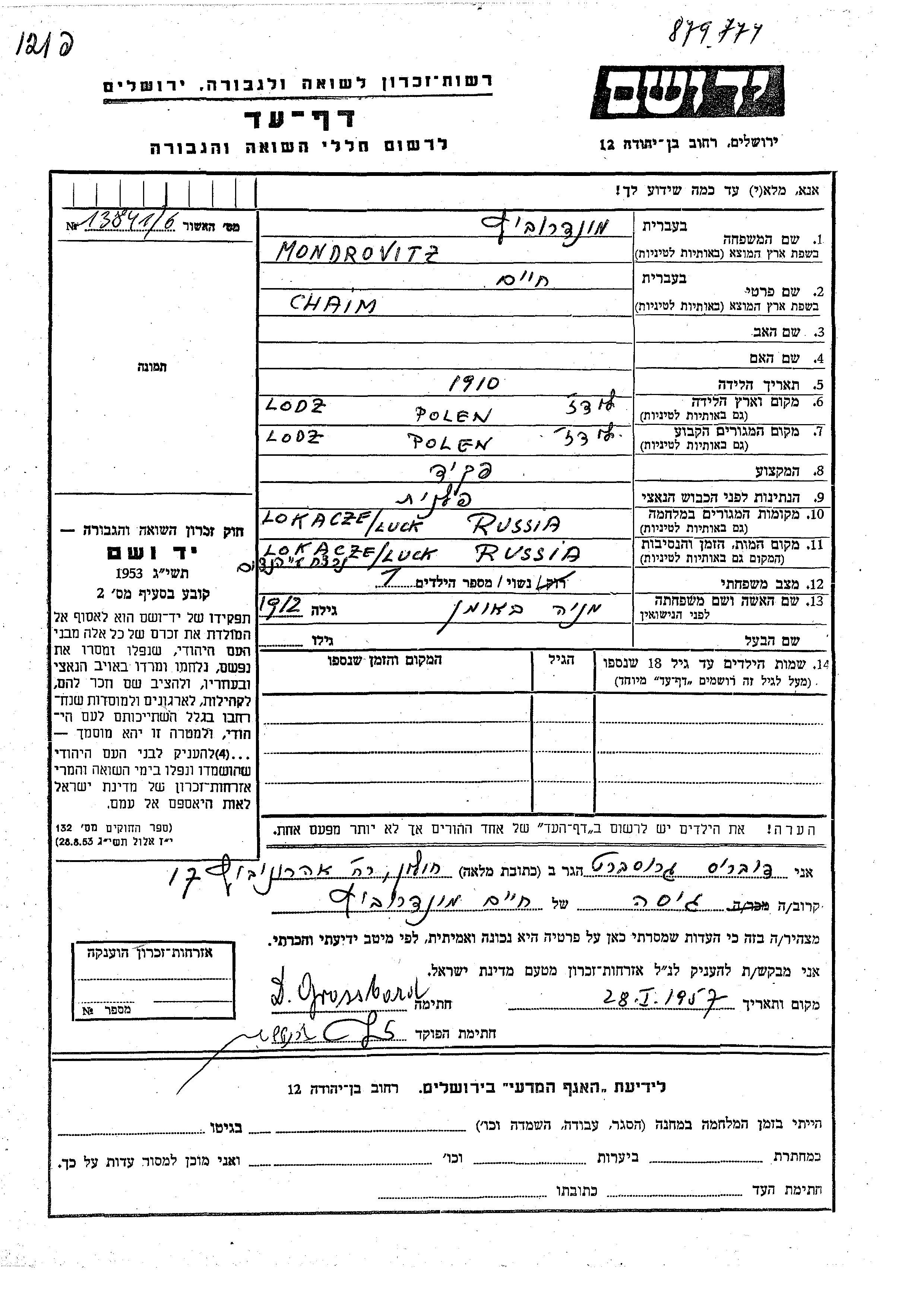 Mondrovitz Chaim 1910 Lodz, Polen Gedenkblatt