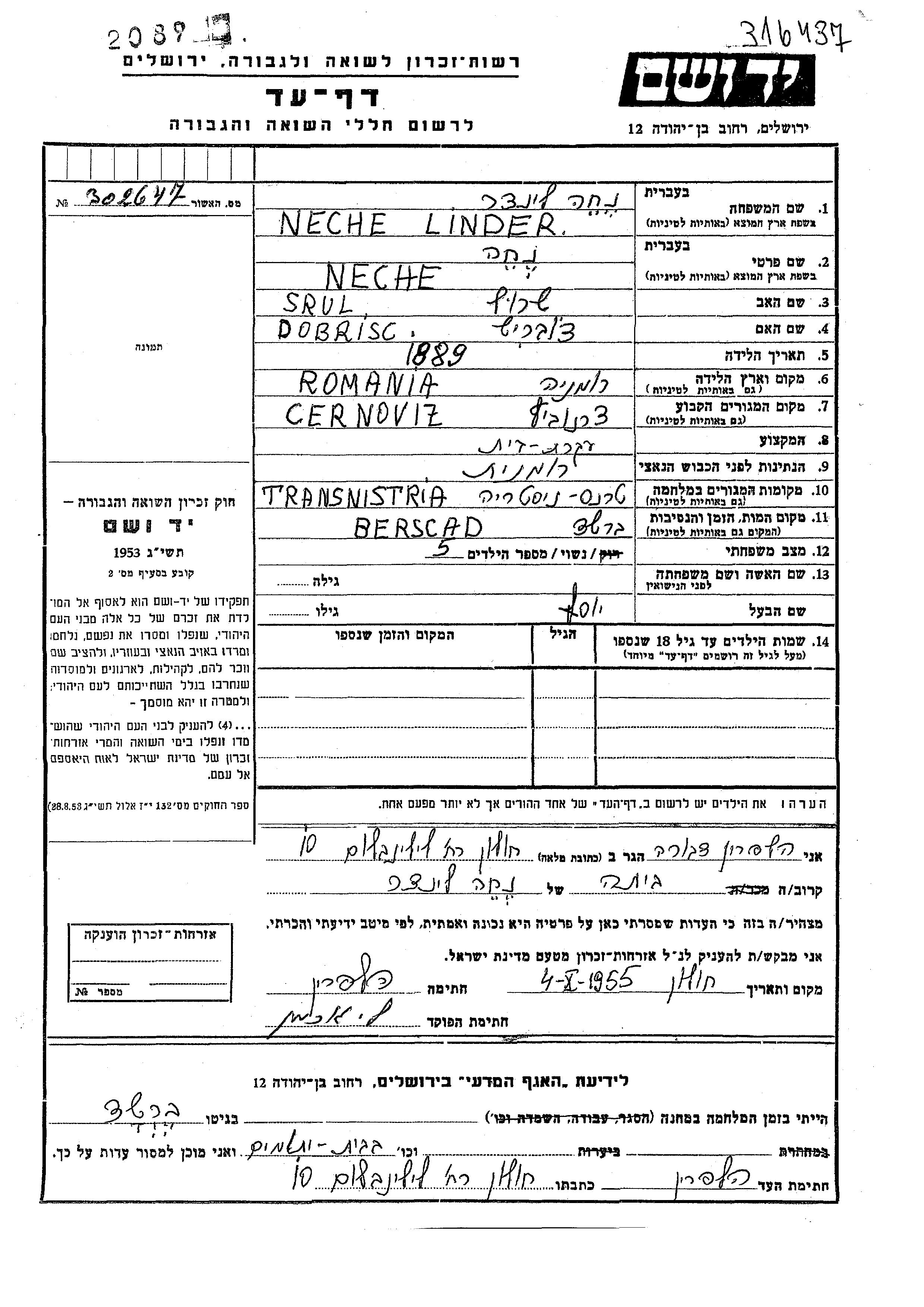 Neche Linder wurde im Jahr 1889 in Rumänien geboren. Sie war die Tochter von Srul und Dobrisc Dobra. Sie war Hausfrau und mit Yosef Verheiratet. Vor dem Zweiten Weltkrieg lebte sie in Czernowitz, Rumänien. Während des Krieges war sie in Transnistria, Ukraine (UdSSR).