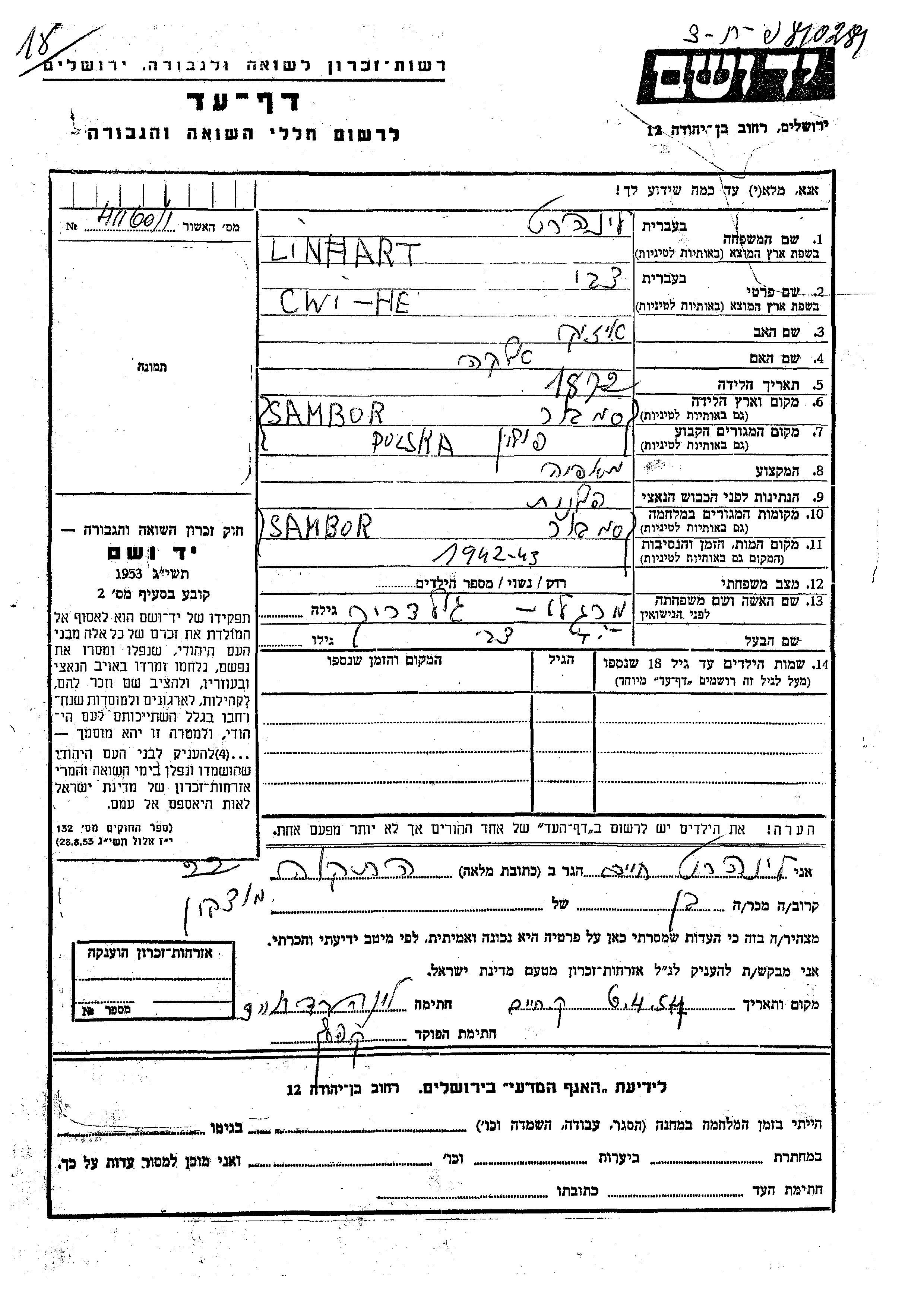 Cwi Linhart wurde im Jahr 1872 in Sambor, Polen geboren. Er war der Sohn von Aizik und Elka. Er war mit Margalit, geb. Goldreikh Verheiratet. Vor dem Zweiten Weltkrieg lebte er in Sambor, Polen. Während des Krieges war er in Sambor, Polen.