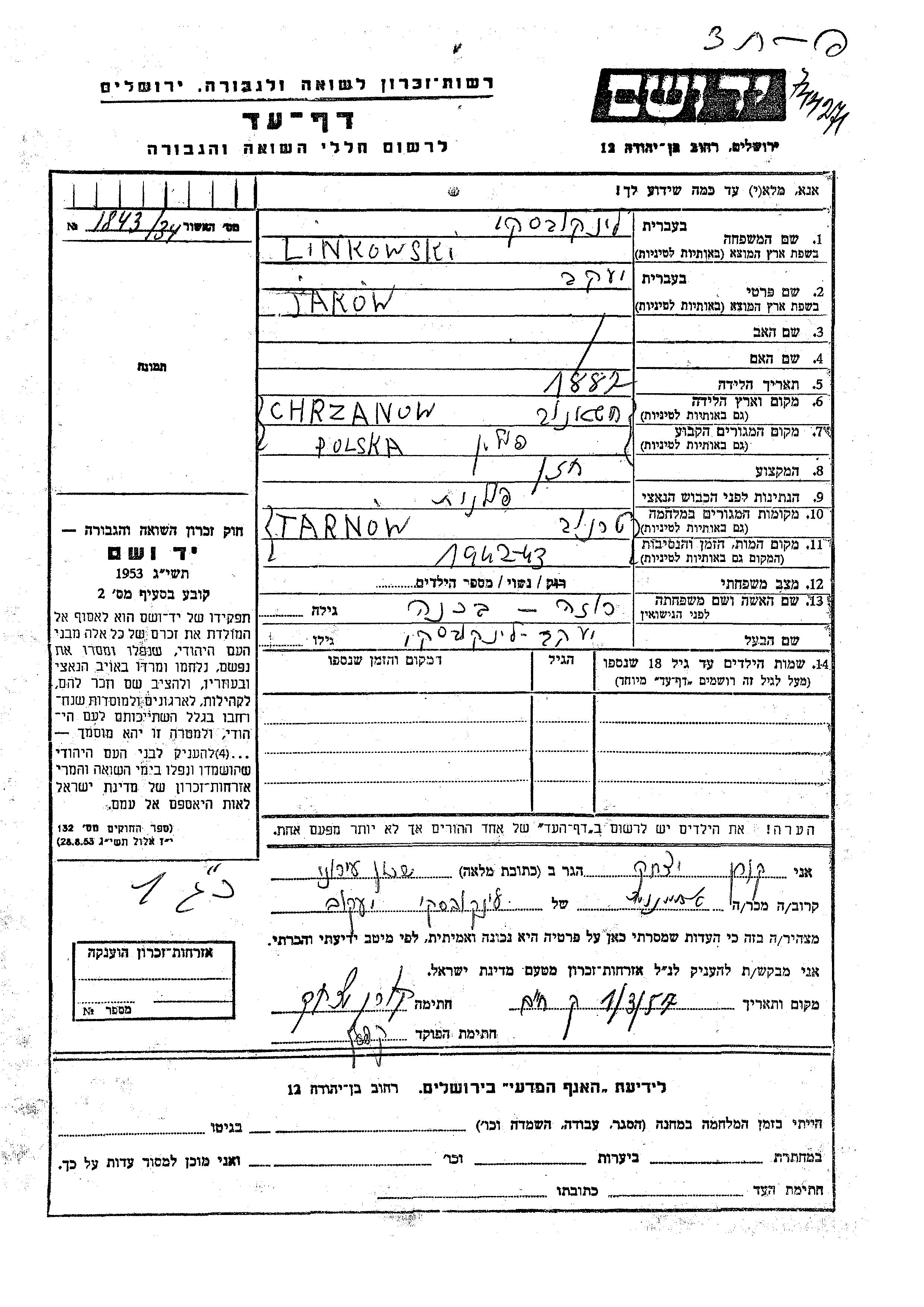 Jakow Linkowski wurde im Jahr 1887 in Chrzanow, Polen geboren. Er war Kantor und mit Roza, geb. Bakhne Verheiratet. Vor dem Zweiten Weltkrieg lebte er in Polen. Während des Krieges war er in Tarnow, Polen.