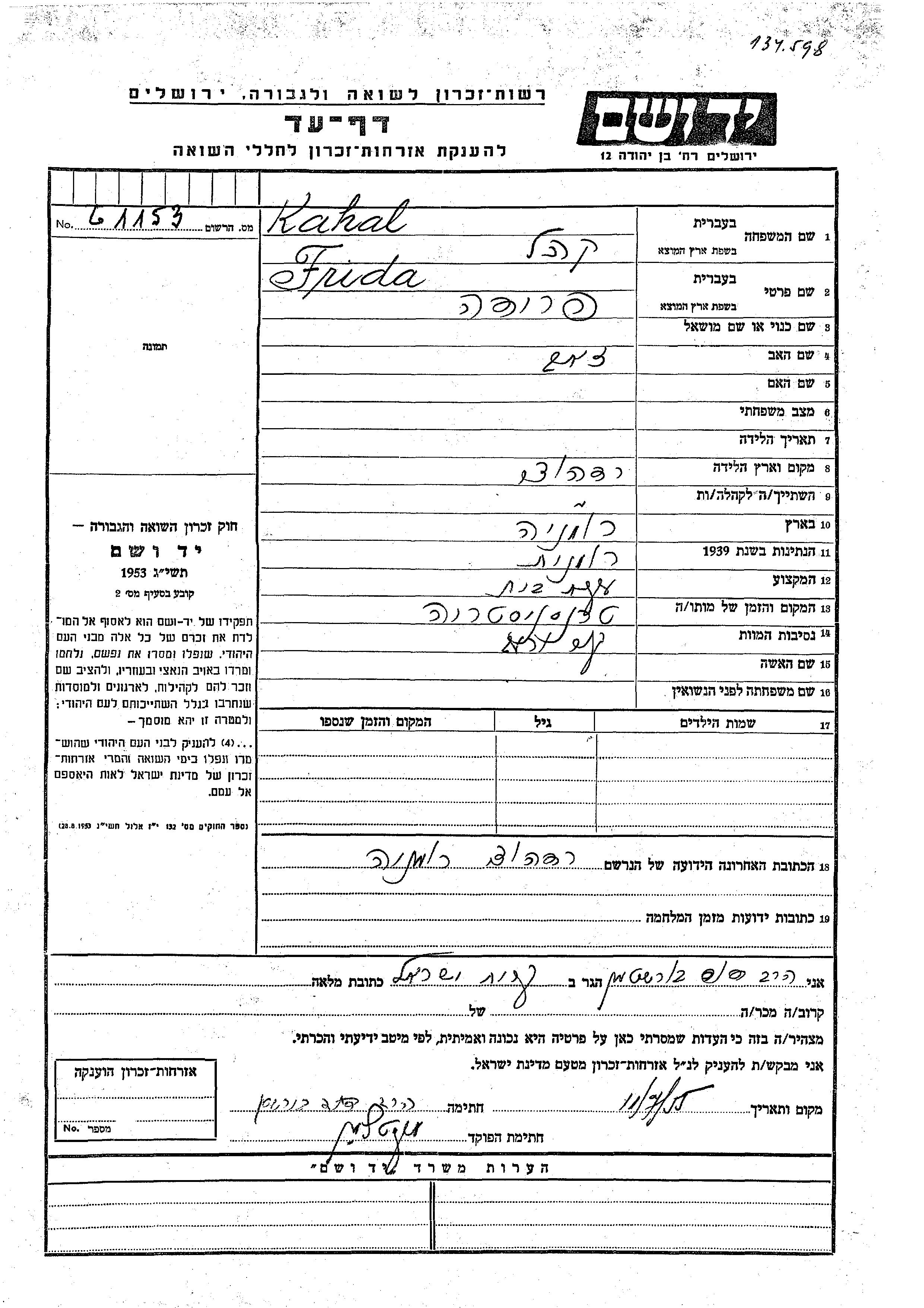 Frida Kahal wurde in Radauc, Rumänien geboren. Sie war die Tochter von Zeev. Sie war Hausfrau. Vor dem Zweiten Weltkrieg lebte sie in Radauc, Rumänien. Während des Krieges war sie in Radauc, Rumänien.