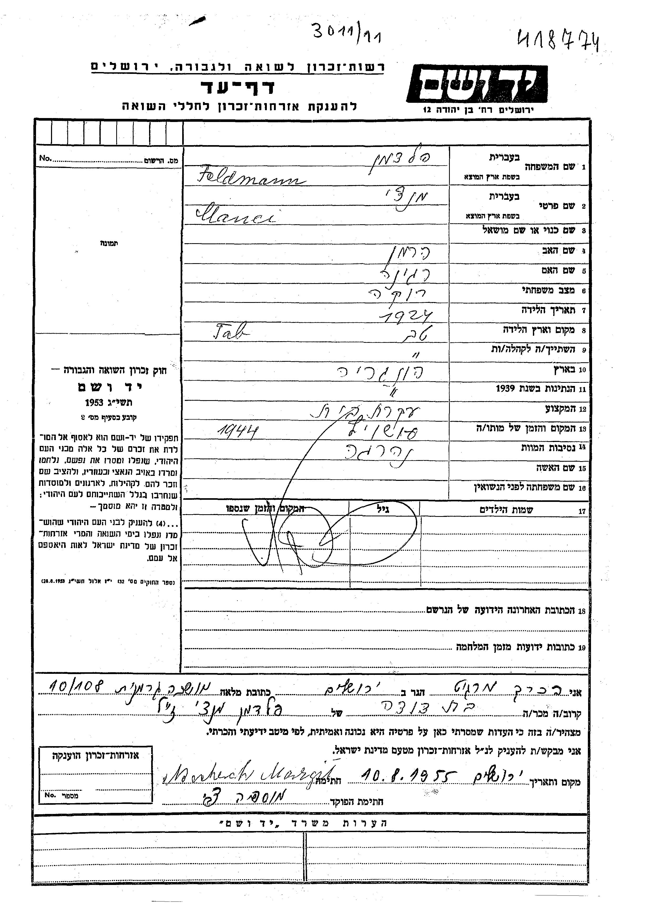 Manci Feldman wurde im Jahr 1924 in Tab, Ungarn geboren. Sie war die Tochter von Herman und Regina. Sie war Hausfrau und Ledig. Vor dem Zweiten Weltkrieg lebte sie in Tab, Ungarn.