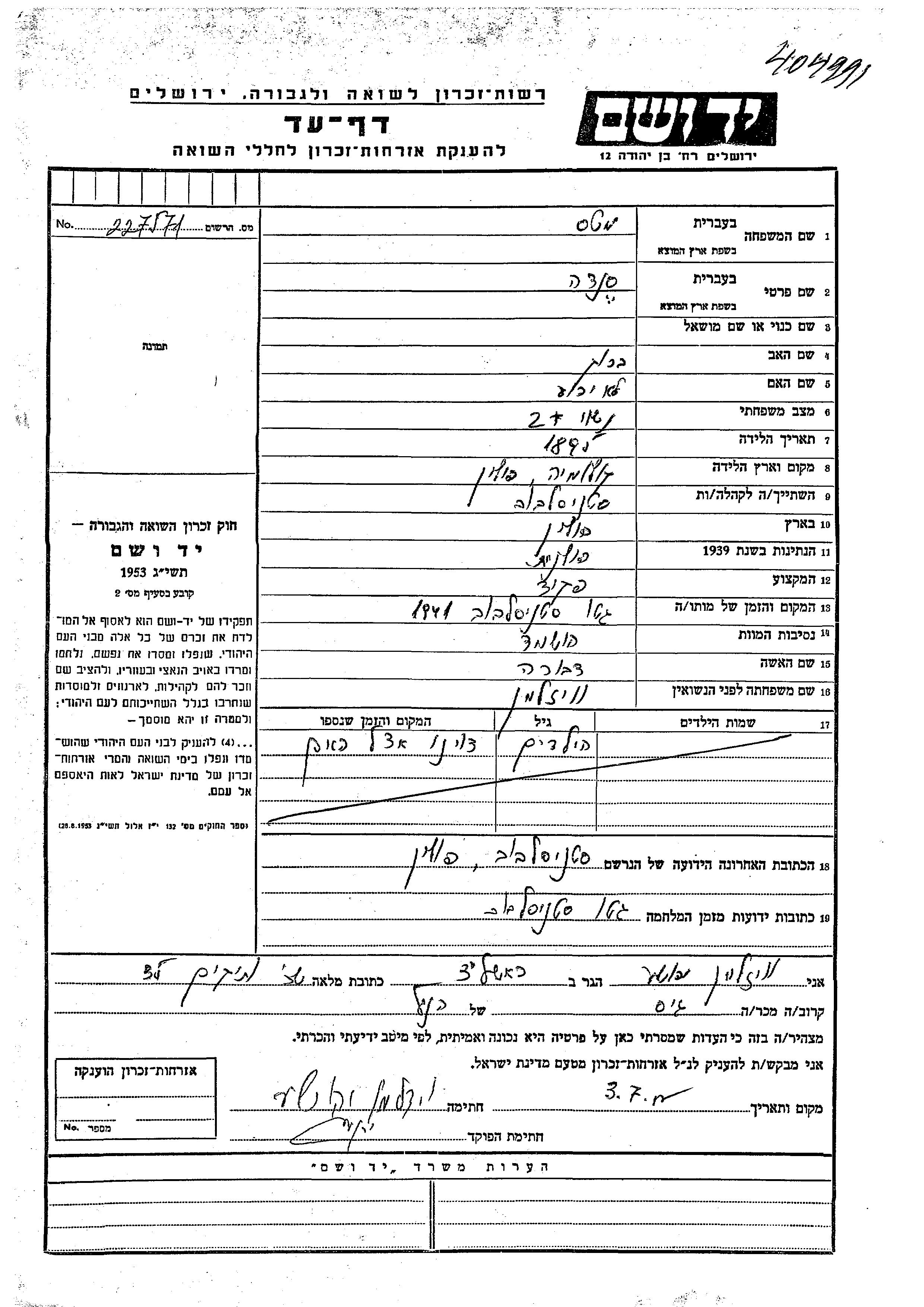 Senda Mates wurde im Jahr 1895 in Kolomyja, Polen geboren. Er war der Sohn von Barukh. Er war Angestellte/-r und mit Dvora, geb. Vizelman Verheiratet. Vor dem Zweiten Weltkrieg lebte er in Stanislawow, Polen. Während des Krieges war er in Stanislawow, Polen.