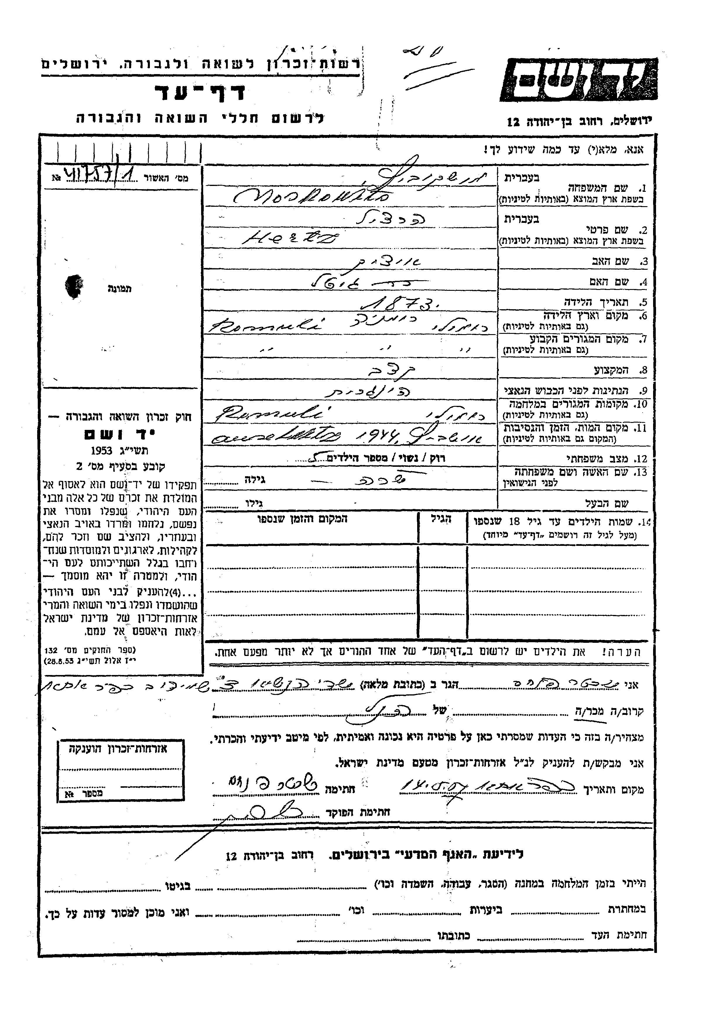 Hertzil Moskowits wurde im Jahr 1873 in Romuli, Rumänien geboren. Er war der Sohn von Itzik und Gitel. Er war Metzger/-in und mit Sara Verheiratet. Vor dem Zweiten Weltkrieg lebte er in Romuli, Rumänien. Während des Krieges war er in Romuli, Rumänien.