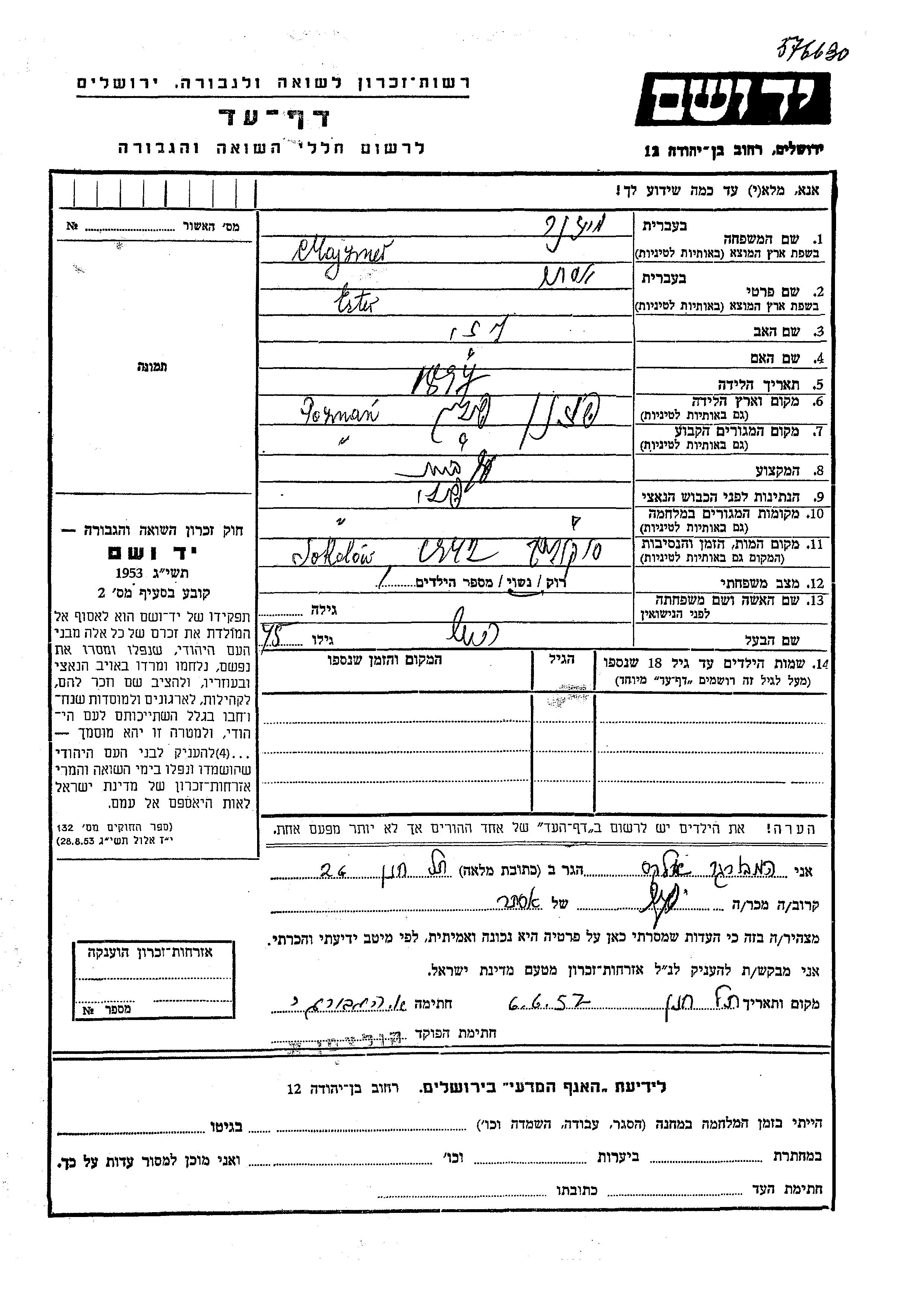 Ester wurde in der Schoah ermordet. Todesort: Sokolow, Polen im Jahr 1942.