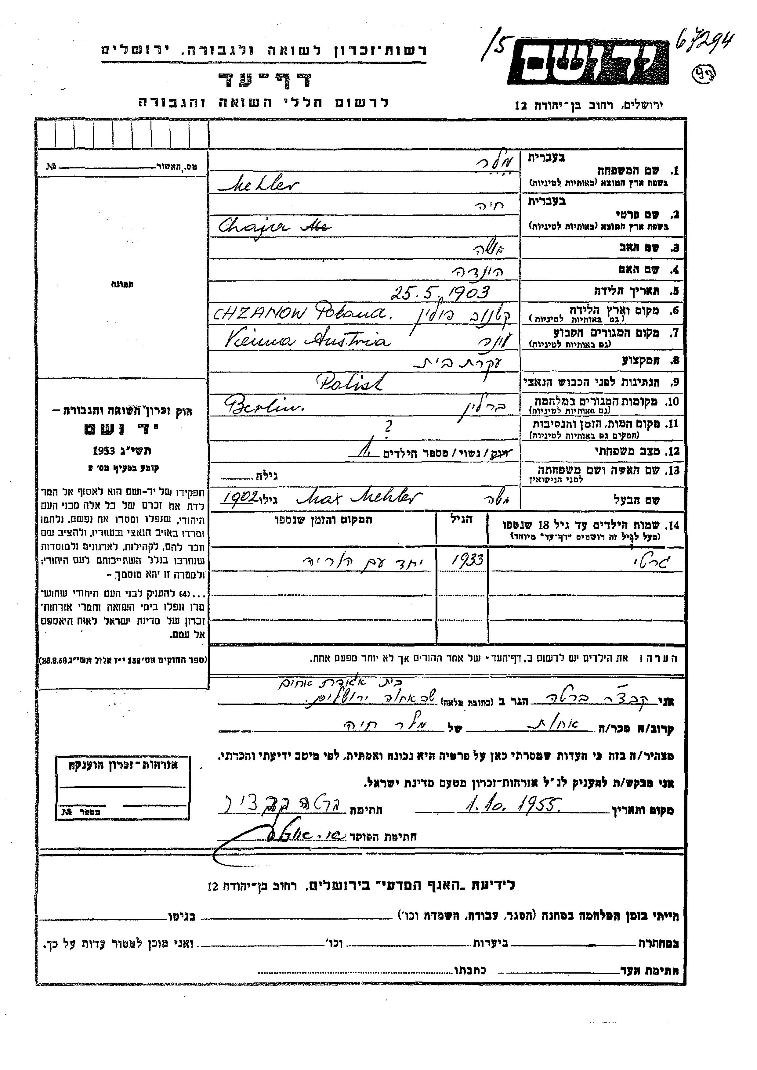 Chaja Meller Maler wurde im Jahr 1903 in Chzanow, Polen geboren. Sie war die Tochter von Moshe und Hinda. Sie war Hausfrau und mit Max Moshe Verheiratet. Vor dem Zweiten Weltkrieg lebte sie in Wien, Österreich. Während des Krieges war sie in Berlin, Deutsches Reich.