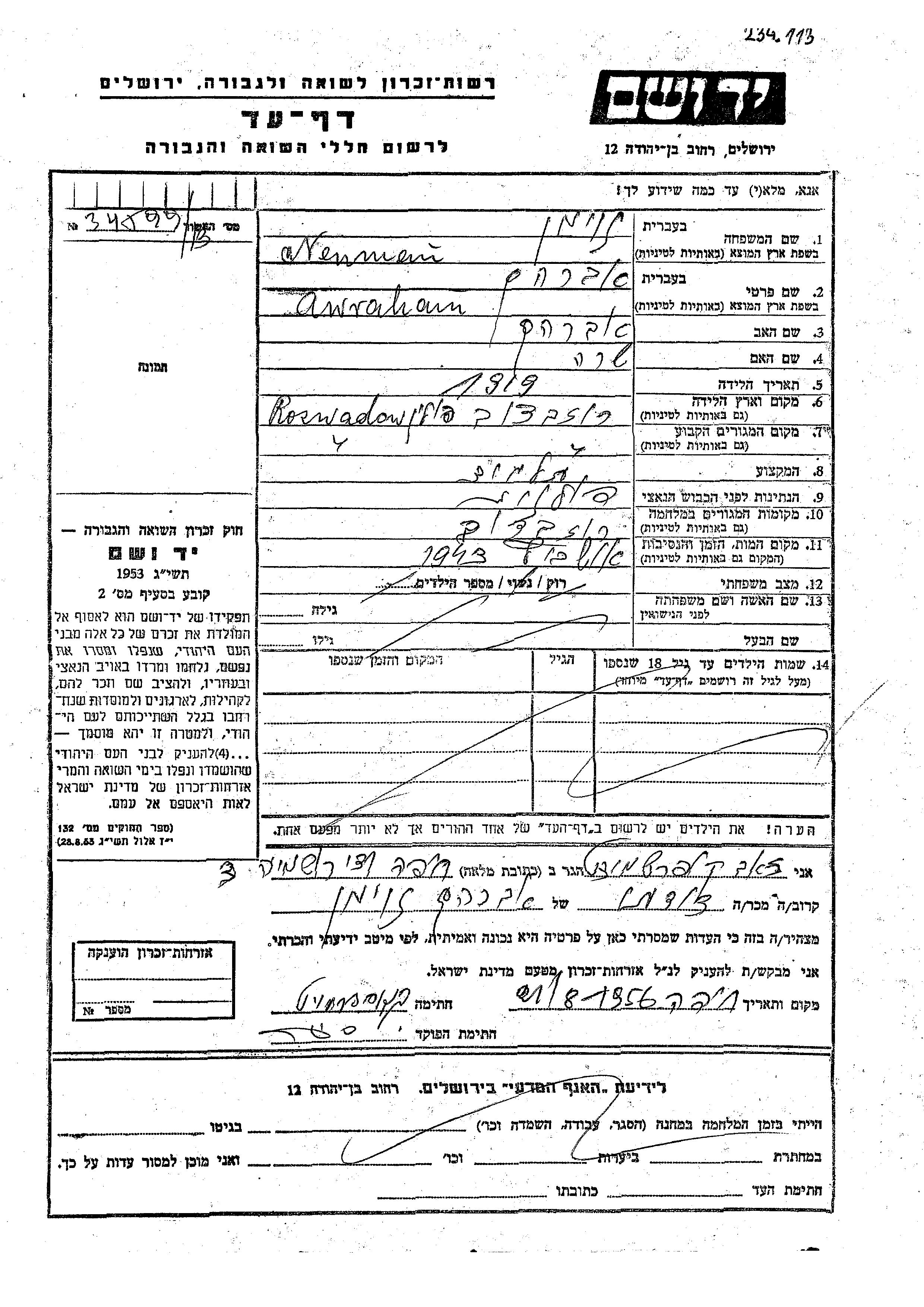 Awraham Neuman wurde im Jahr 1919 in Rozwadów, Polen geboren. Er war der Sohn von Avraham und Sara. Er war Schüler/-in und Ledig. Vor dem Zweiten Weltkrieg lebte er in Rozwadów, Polen. Während des Krieges war er in Rozwadów, Polen.