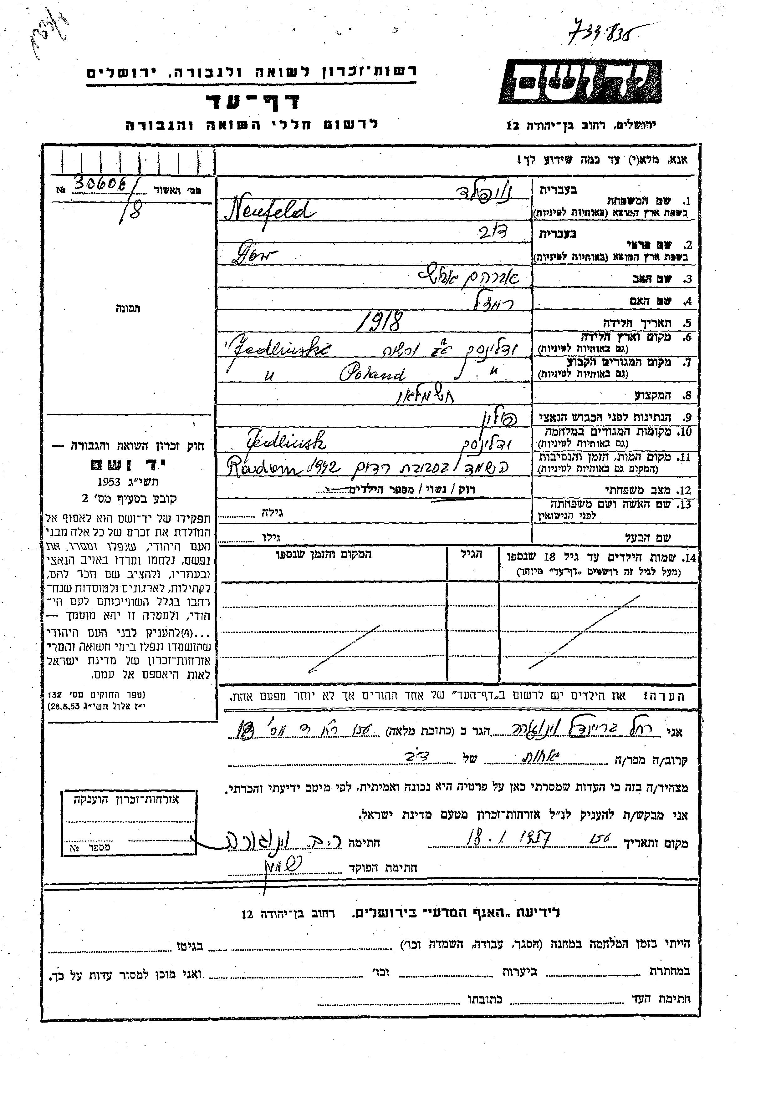 Dow Neufeld wurde im Jahr 1918 in Jedlinsk, Polen geboren. Er war der Sohn von Avraham Aba und Reizl. Er war Elektriker/-in. Vor dem Zweiten Weltkrieg lebte er in Jedlinsk, Polen. Während des Krieges war er in Jedlinsk, Polen.