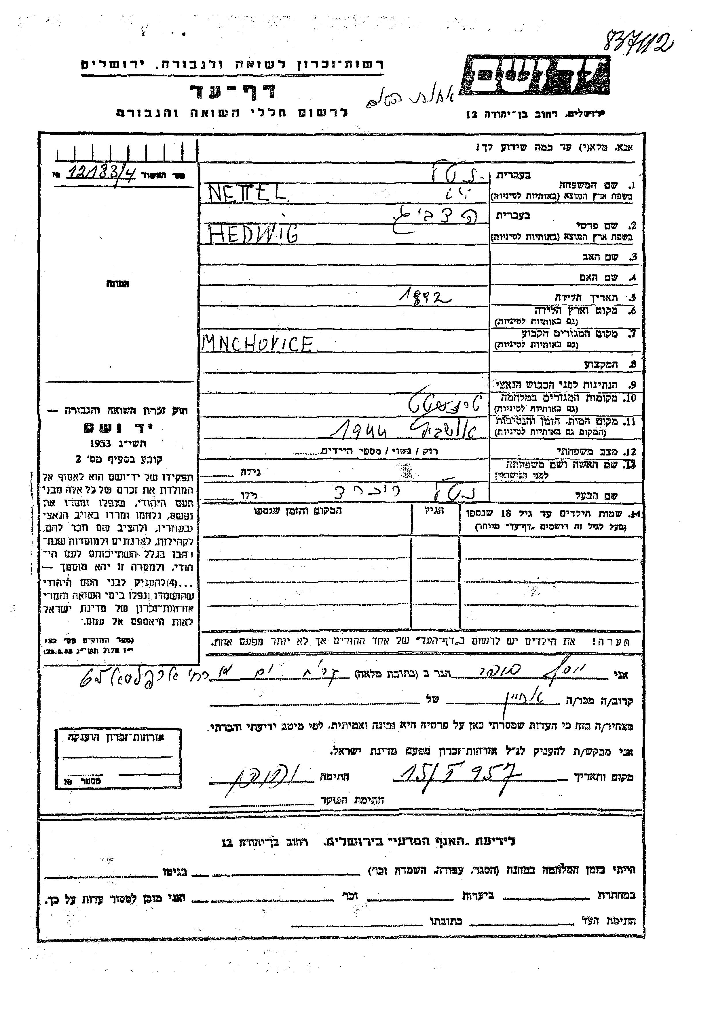 Hedwig Nettel wurde im Jahr 1892 geboren. Sie war mit Rikhard Verheiratet. Vor dem Zweiten Weltkrieg lebte sie in Mnichovice, Tschechoslowakei. Während des Krieges war sie in Terezin, Tschechoslowakei.