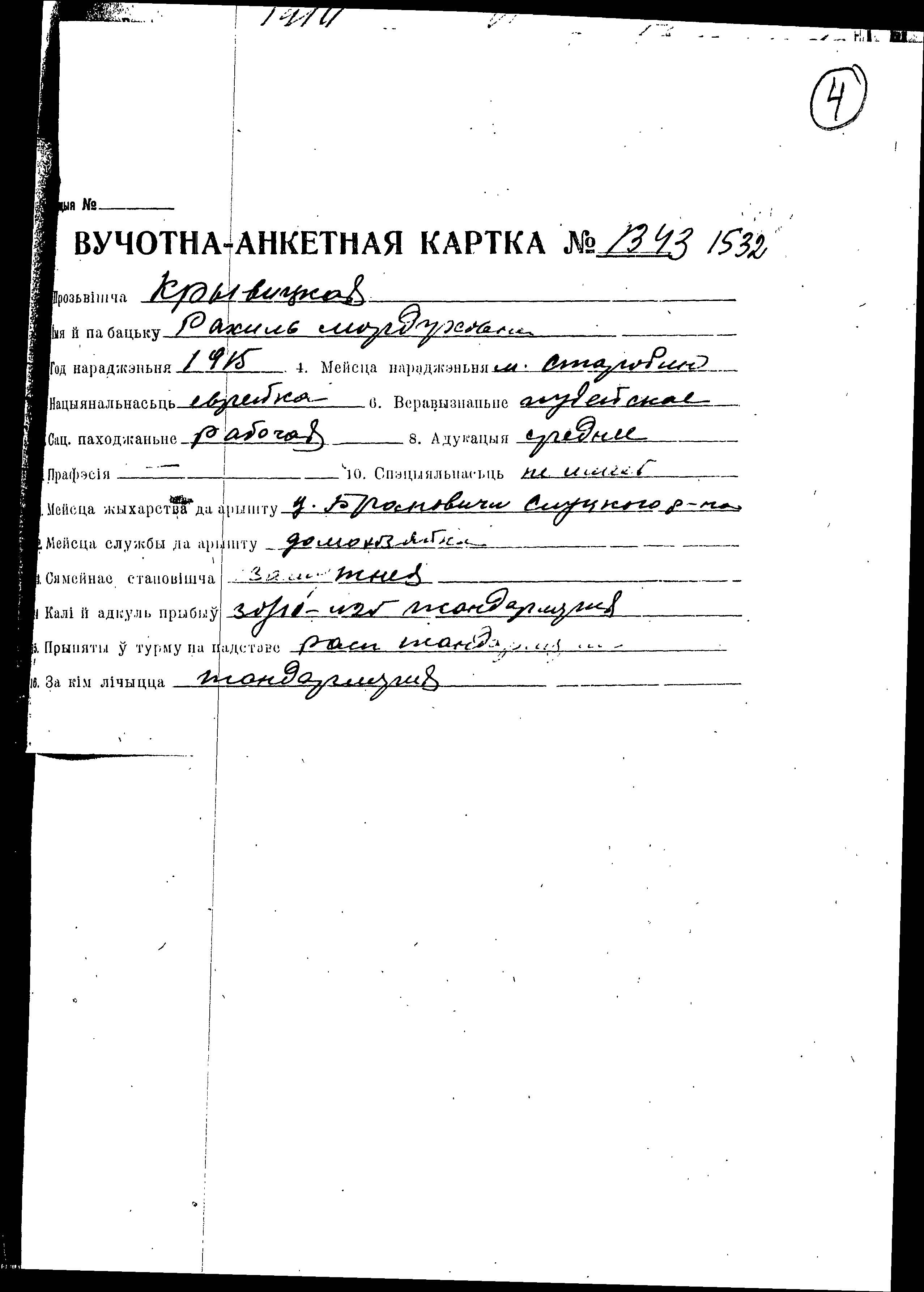 Rakhil Kryvitzkaya wurde im Jahr 1915 in Starobin, Weißrussland (UdSSR) geboren. Sie war die Tochter von Mordukh. Sie war Hausfrau und Verheiratet. Vor dem Zweiten Weltkrieg lebte sie in Baranovichi, Polen. Während des Krieges war sie in Slutsk, Weißrussland (UdSSR).